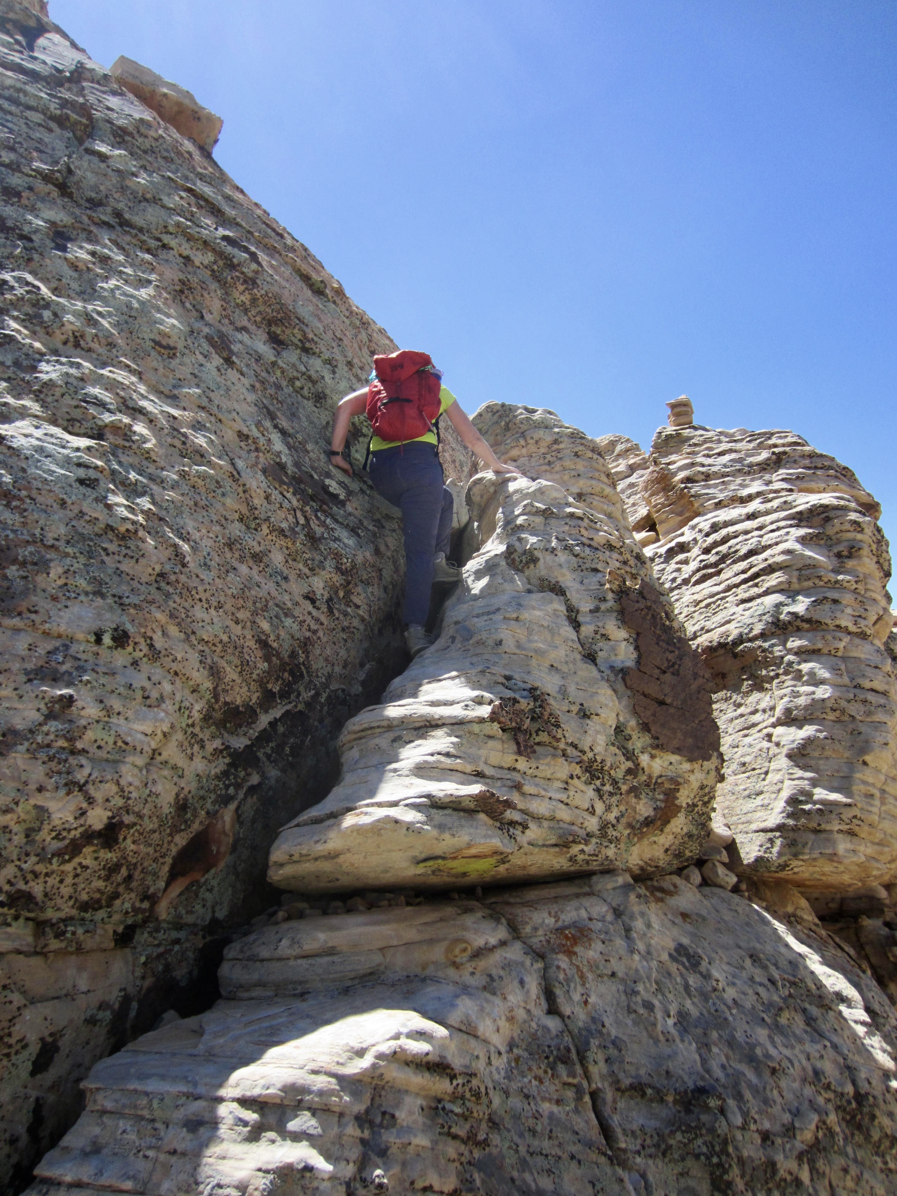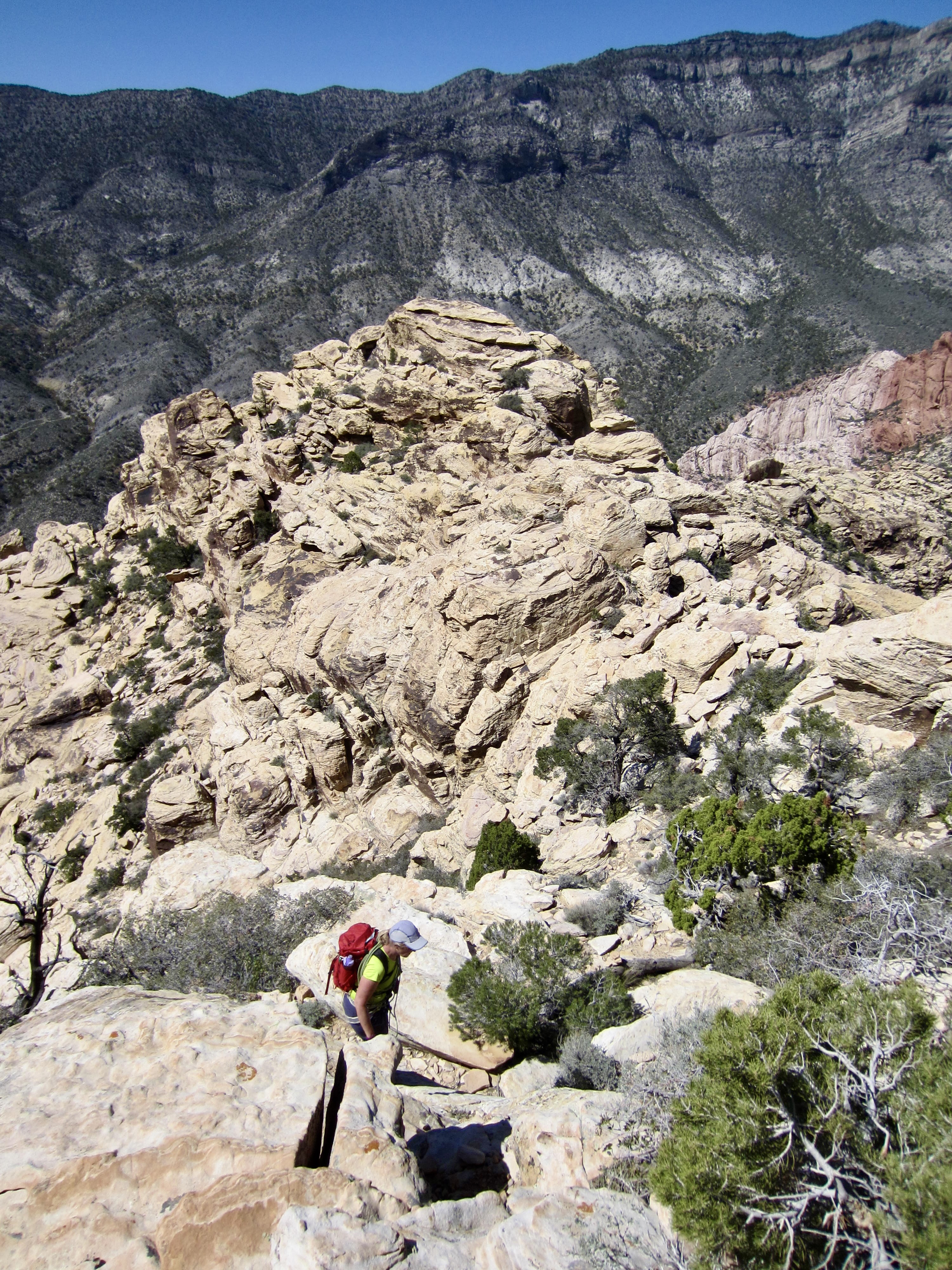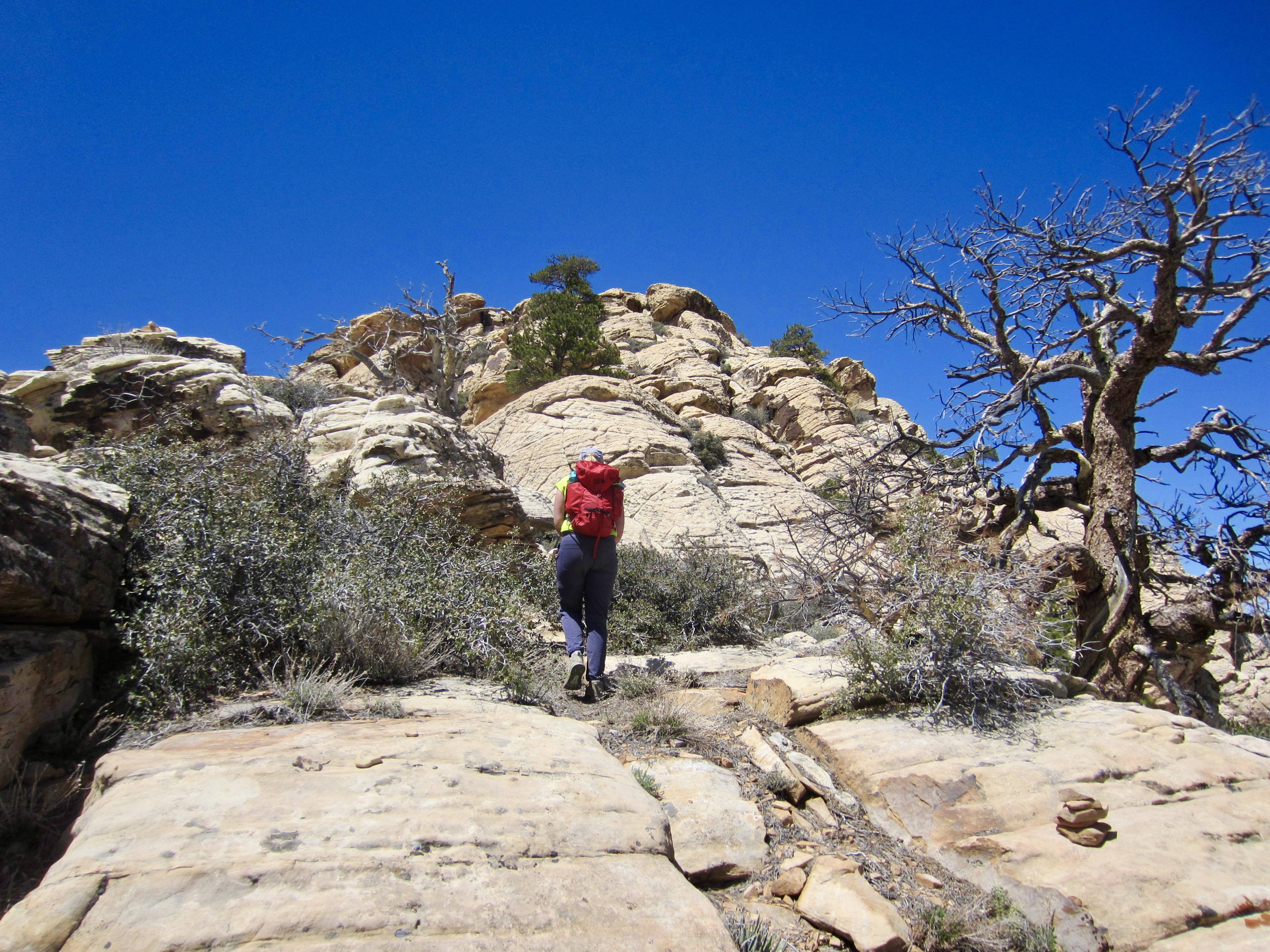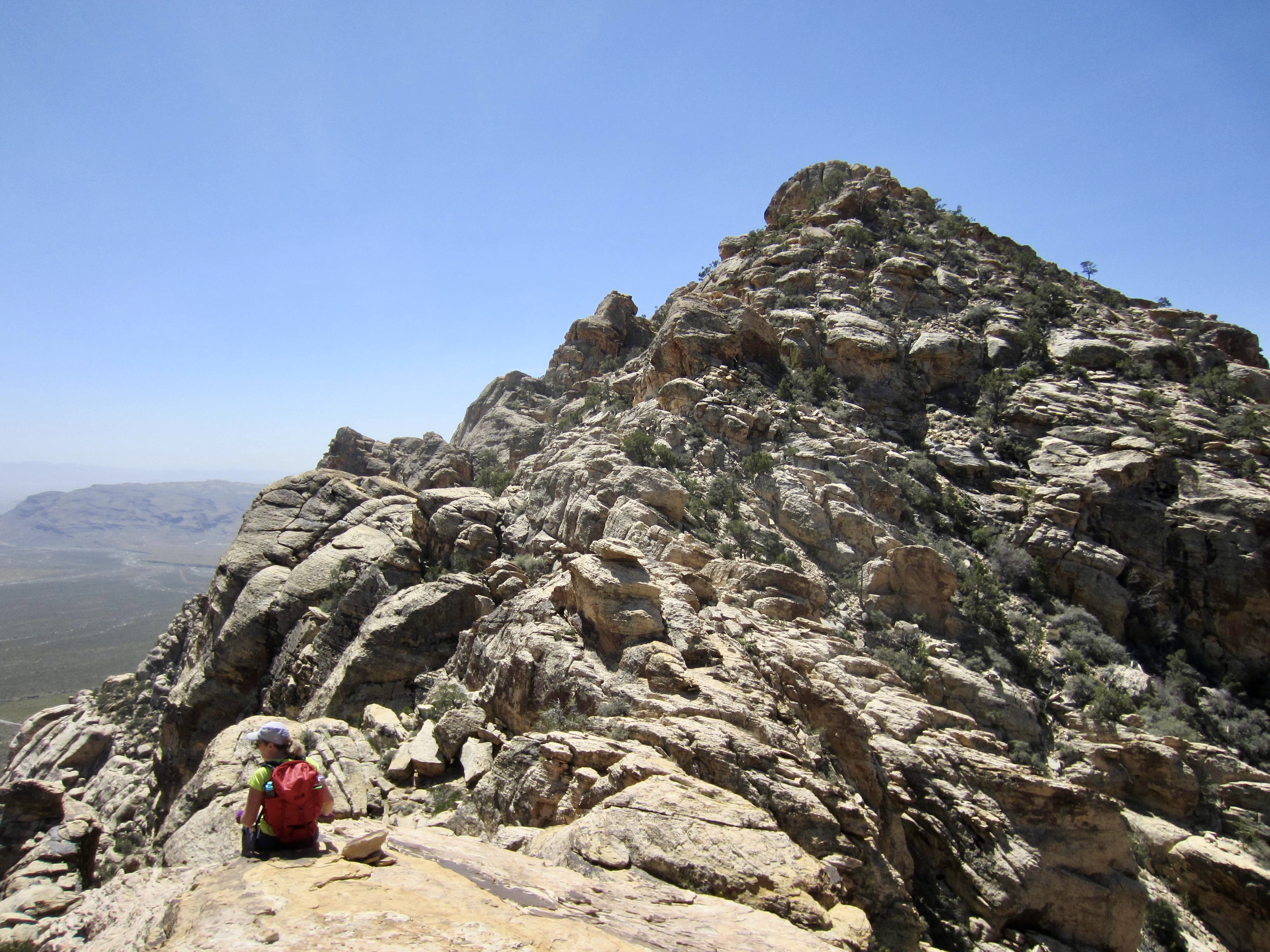 We eventually stepped atop The Plinth—a broad, flat sandstone platform at 6040 feet on the ridge crest. (I like to imagine that The Monolith once sat here but was blown off during one of those infamous Red Rock windstorms.) Although the false summit is now much closer, the route is no more obvious. We continued upward, still following markers back and forth along the bouldery crest.