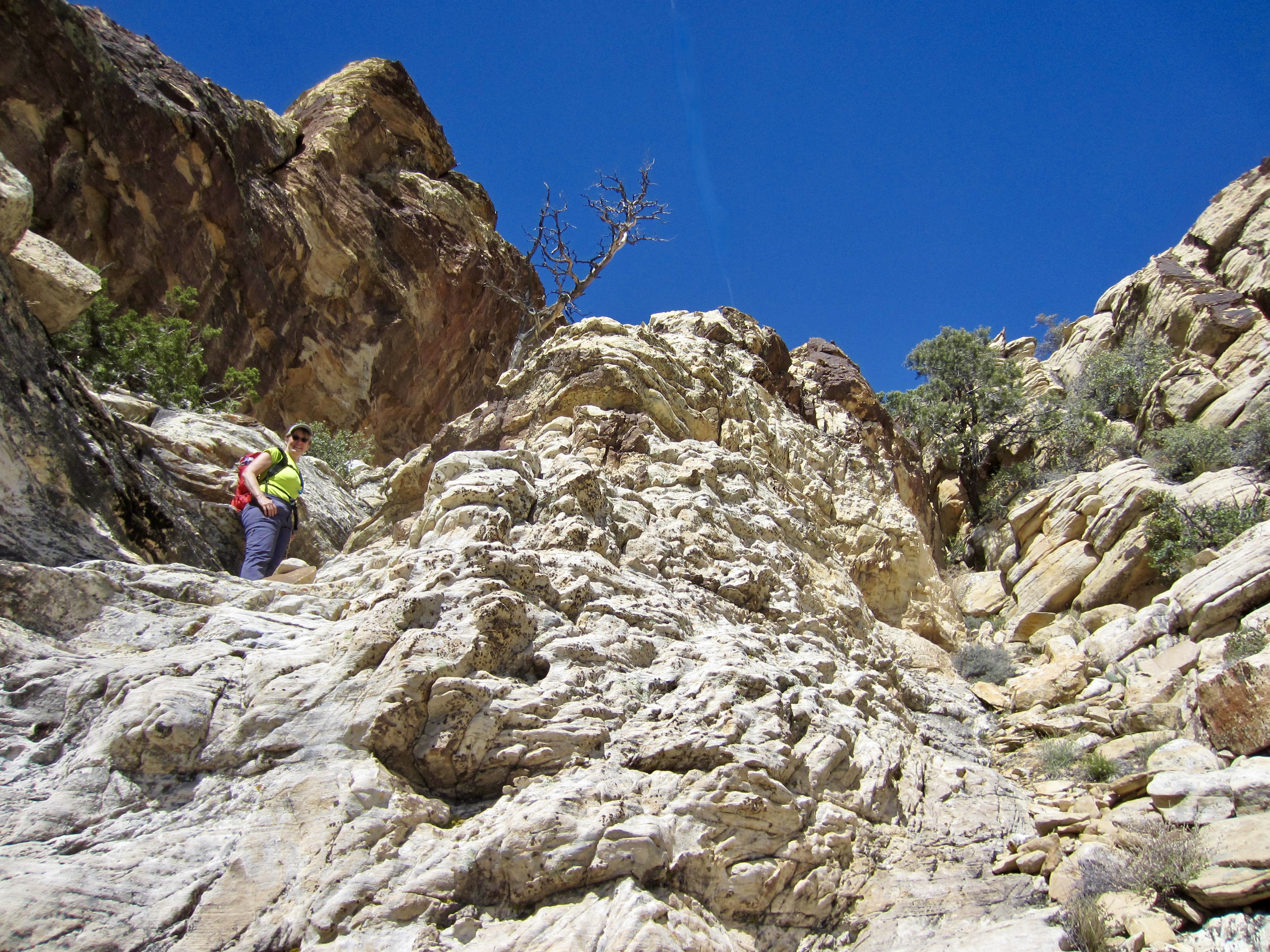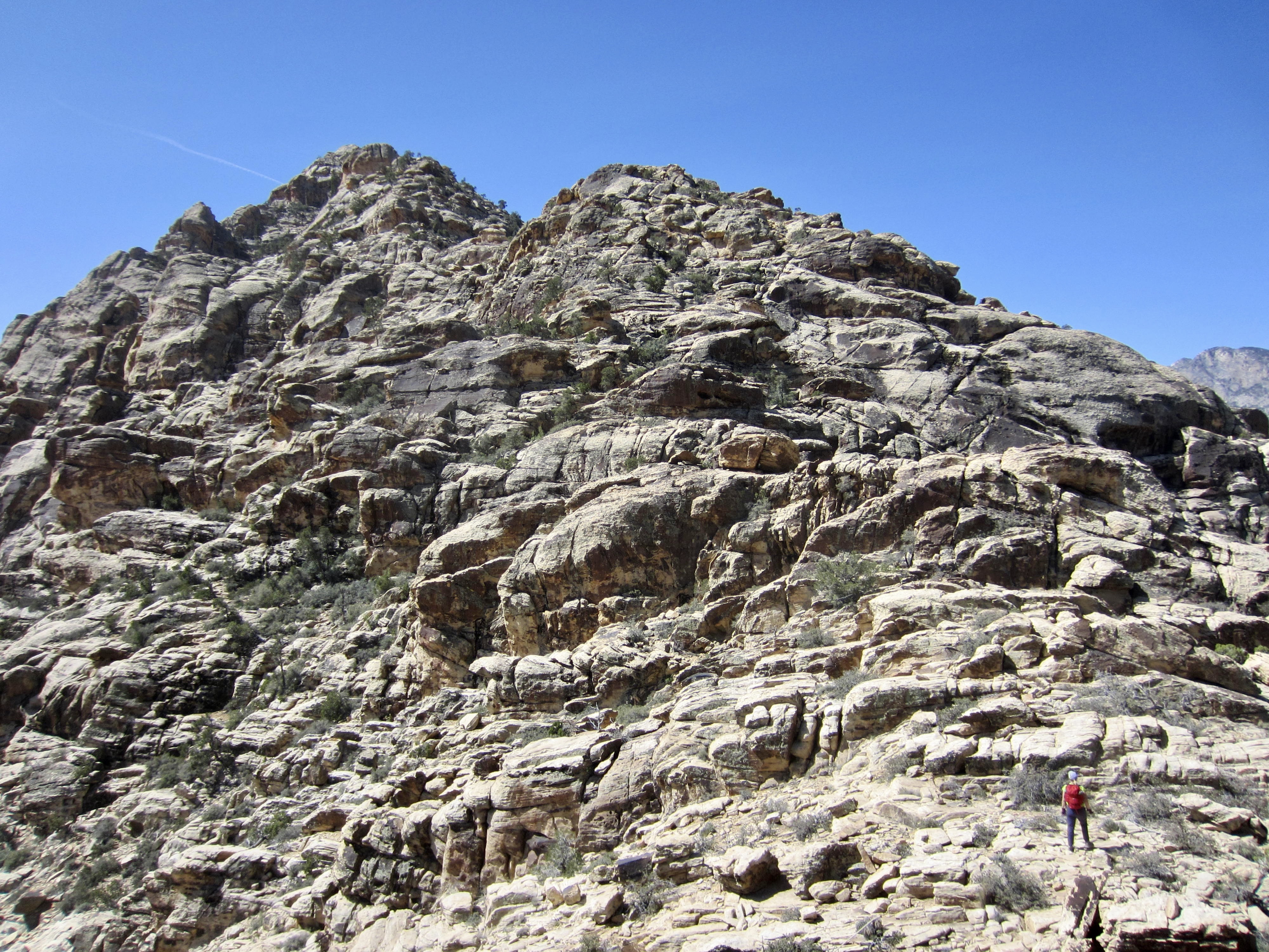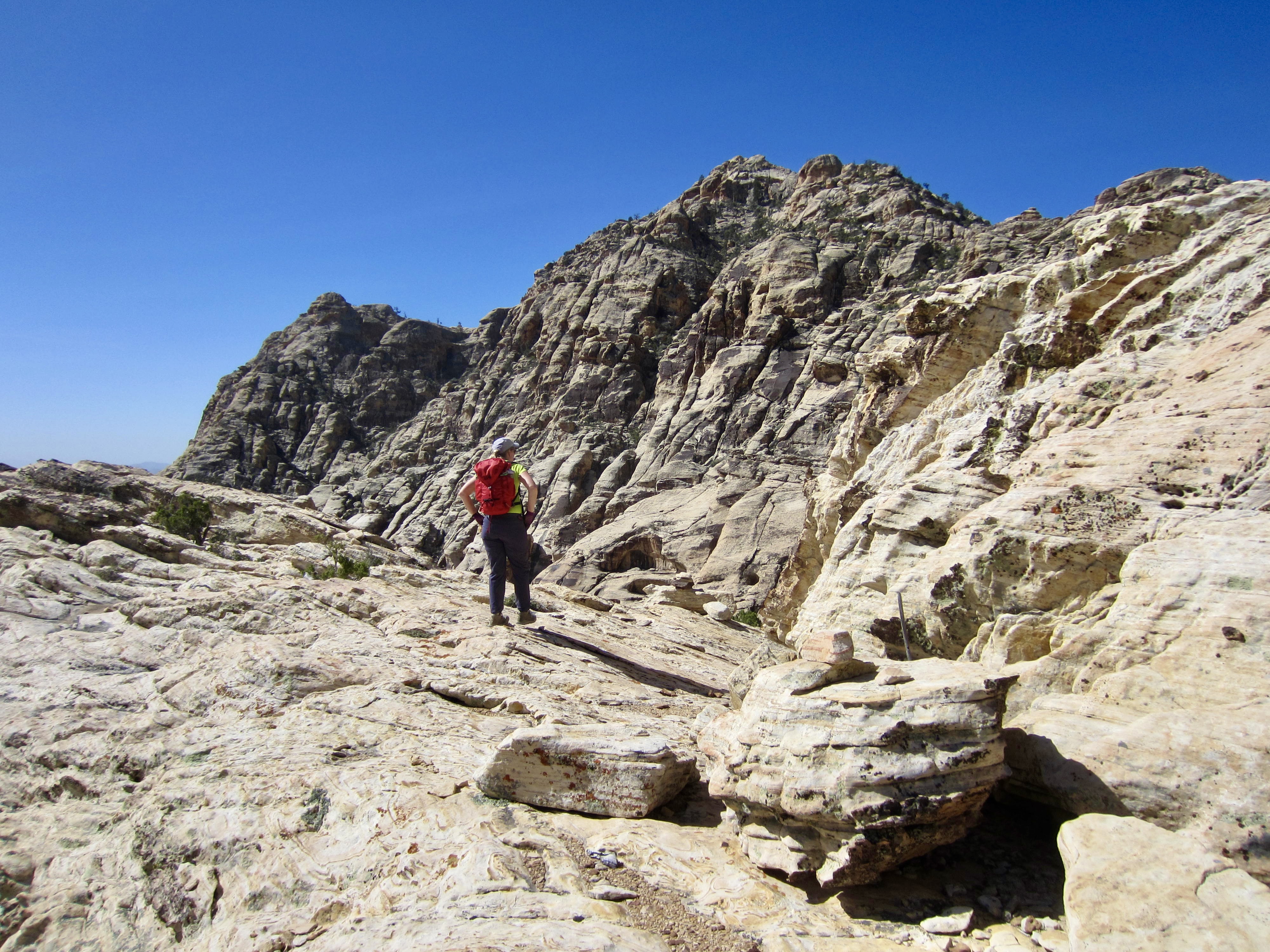 The highest point in the White Rock Hills of Red Rock Canyon National Conservation Area bears several different informal names, including White Rock Mountain, White Rock Peak, and White Rock Hills Peak. Regardless of what moniker you prefer—I like the concise name White Rock Peak—this 6462-foot summit makes a very attractive scrambling destination due to its white-colored sandstone, challenging terrain, considerable prominence, and extremely visible location at the head of Red Rock Basin. It has gained additional popularity in recent years by virtue of being on Branch Whitney’s 52 Peak Club summit list.