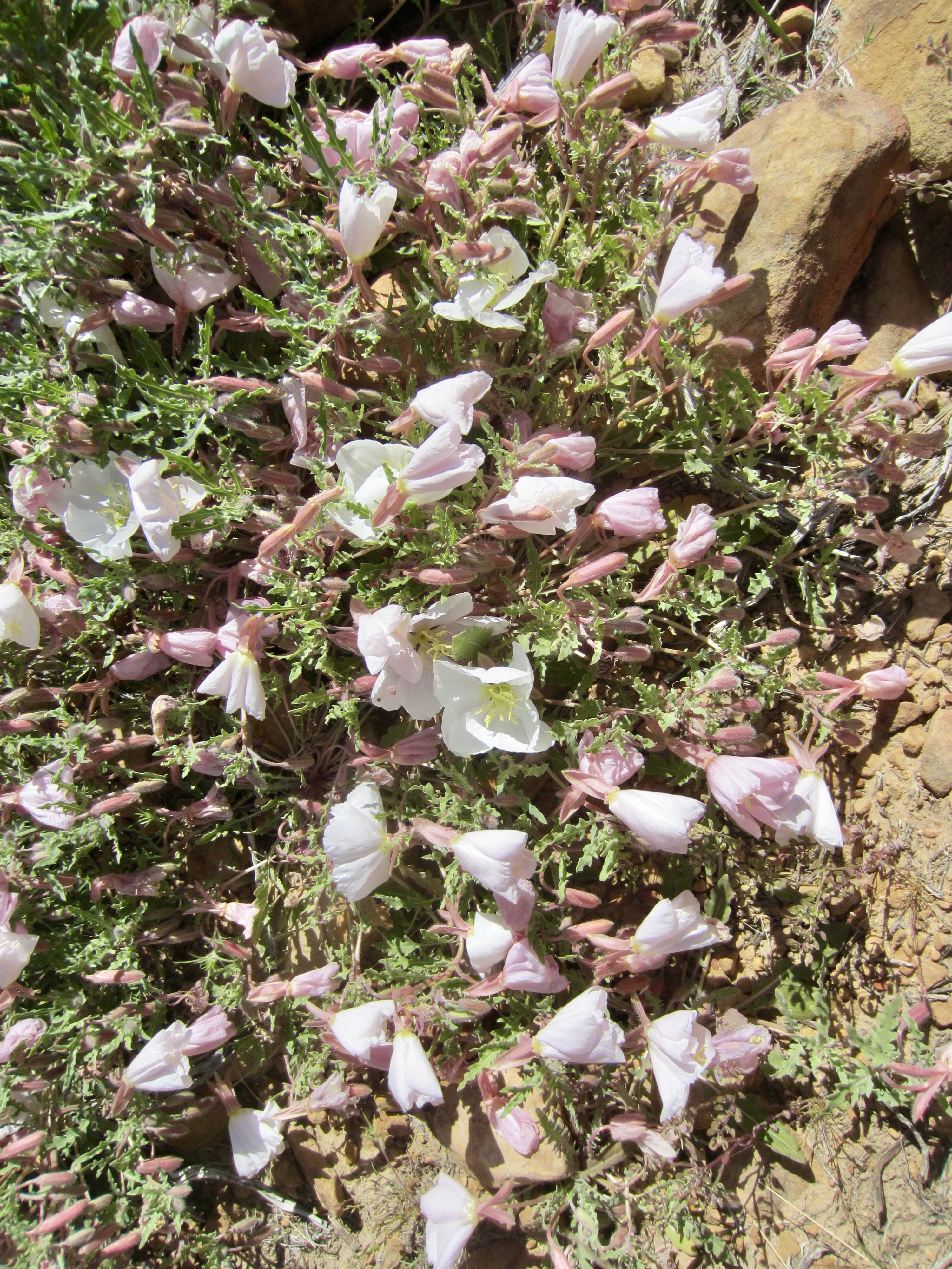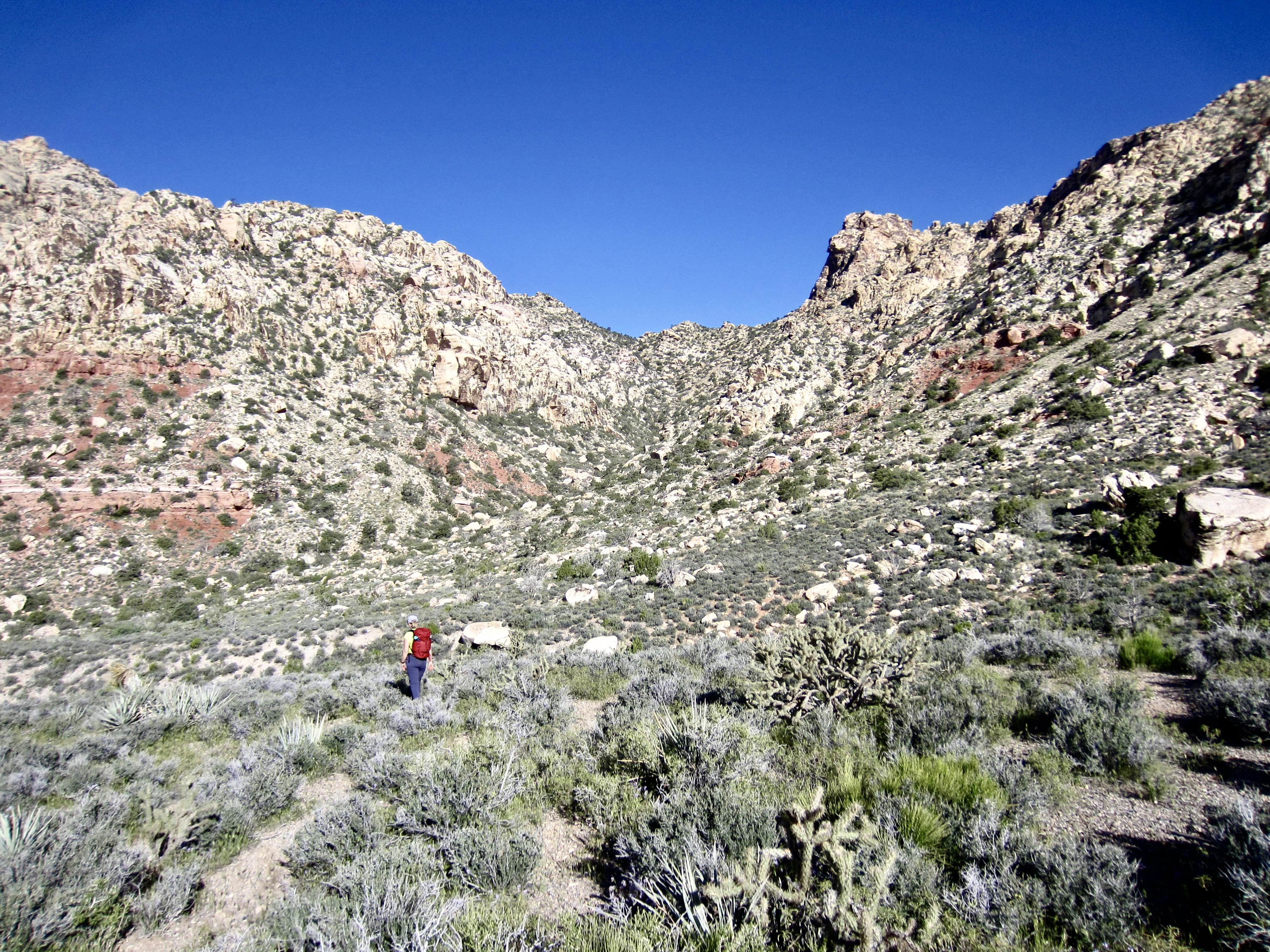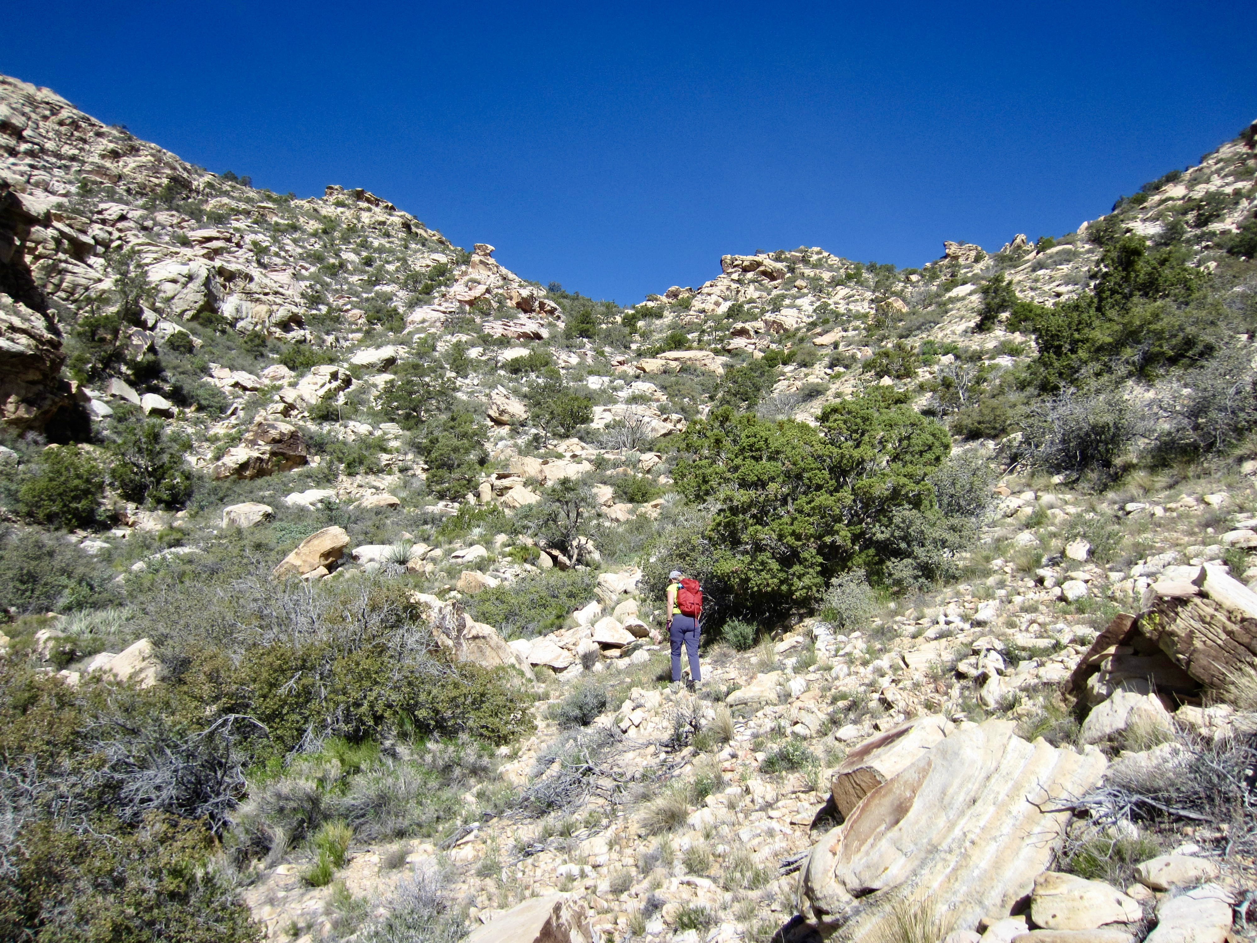 We crossed over the wash and began a rising northwesterly traverse across sandy slopes covered with scrub plants, cacti, and scattered boulders. White Rock Saddle could be clearly seen as the deep sag in the ridge crest ahead.