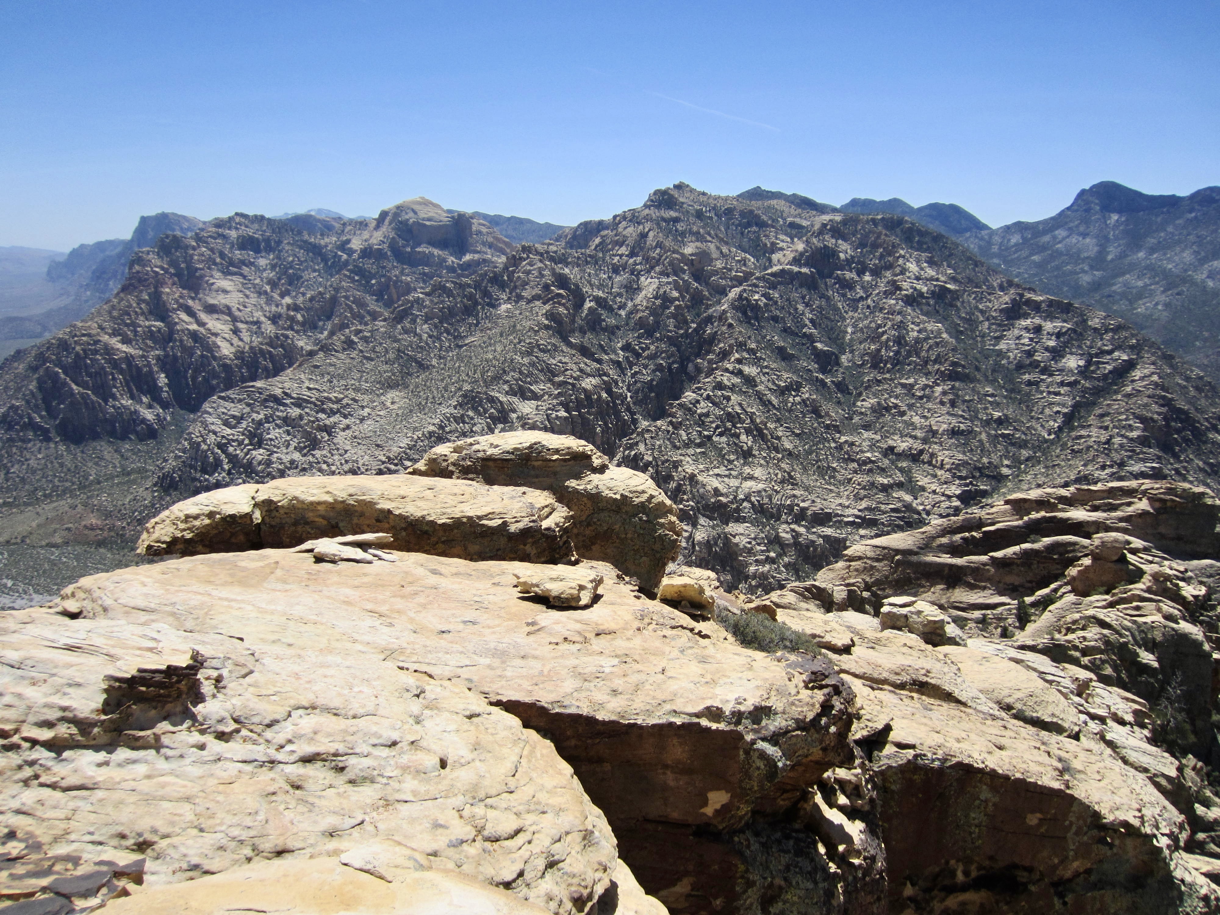 Not surprisingly, this summit offers an unobstructed view of the entire Red Rock Basin and all of the surrounding landforms, ranging from Calico Hills and Turtlehead Peak on the left to Bridge Mountain and North Peak on the right. There was an old ammunition can tucked into the rocks (does every summit at Red Rocks have an ammo can register?) but only a single scrap of paper inside.