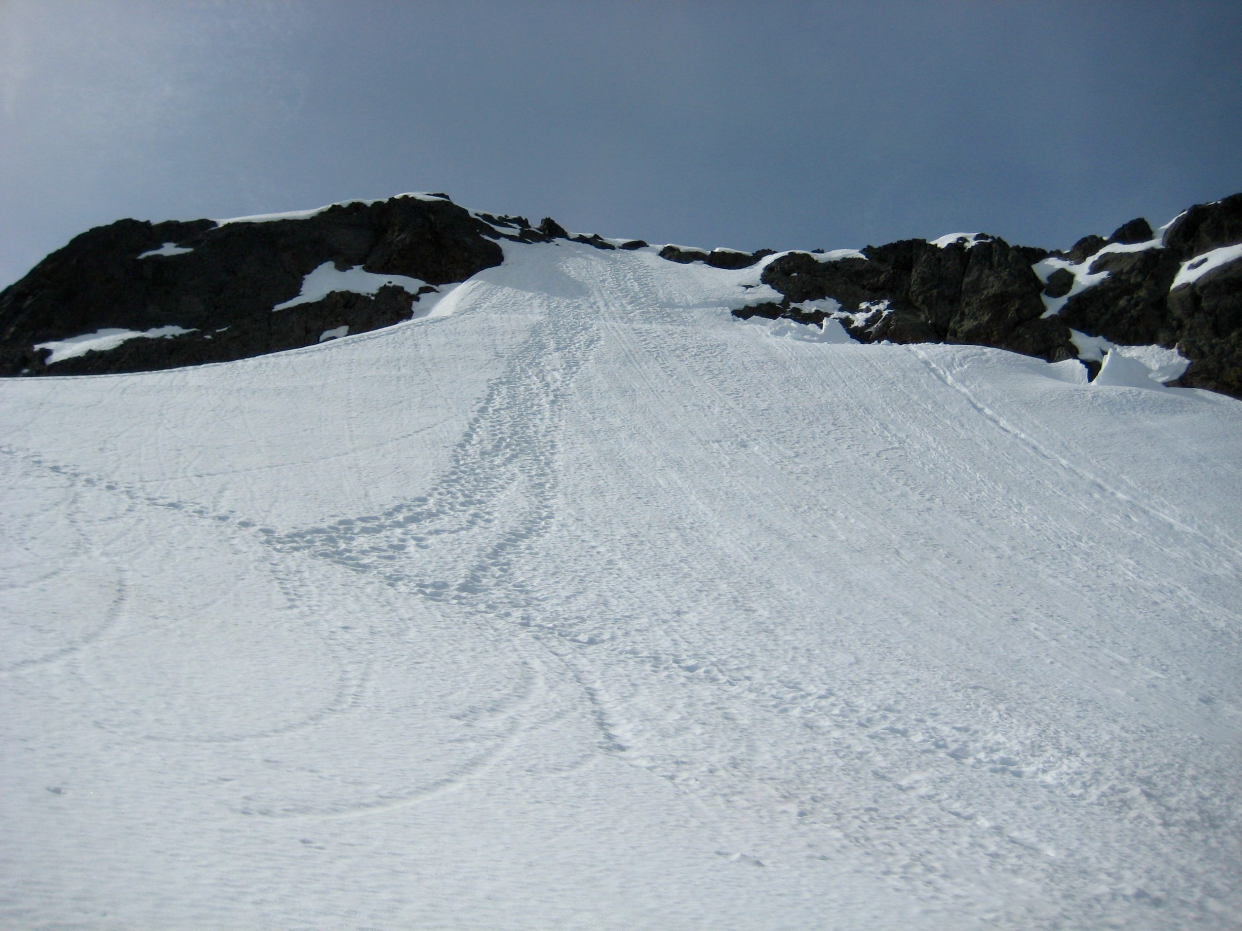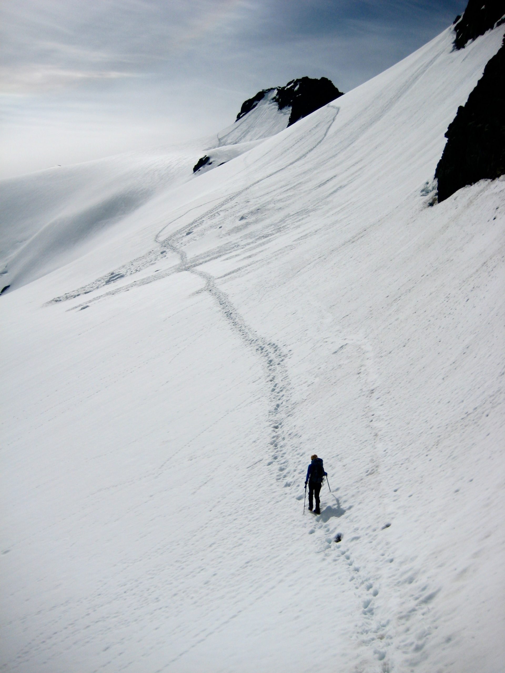 Snow conditions were surprisingly soft on the glacier as we made a rising southeasterly traverse.  The upper 12 to 18 inches was very mushy, even in the old tracks.