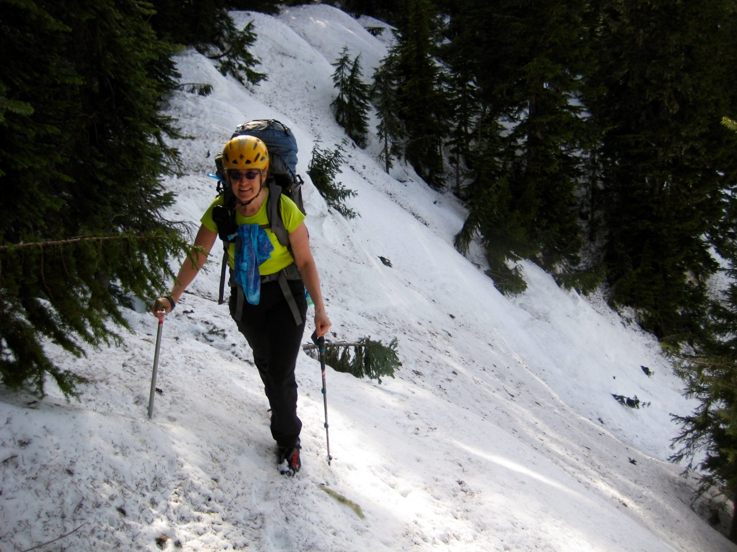 We hiked up the overgrown road for 1½ miles to the original Niederprum Trailhead (0.7 hours + 400 feet from car), then turned onto the trail.  For the first 1000 feet, this old mining trail is actually quite civilized as it passes through shady evergreen forest.  Then, rather abruptly and rather rudely, it degenerates into a steep climbers’ path, with numerous muddy spots, rocky steps, and fallen logs.  Continuous snow was encountered around 3200 feet, and soon after, Whitehorse Mountain could be seen through the forest.