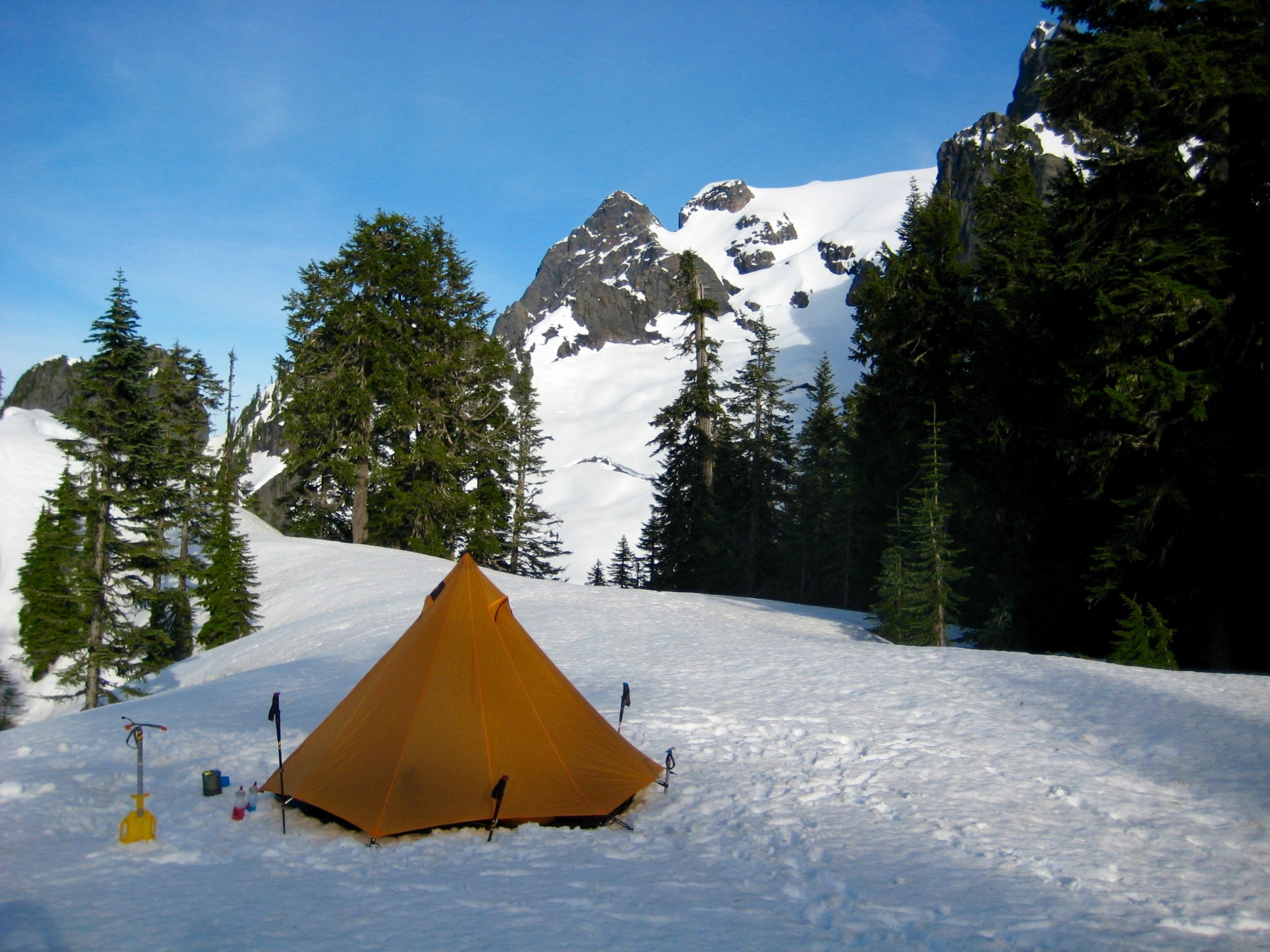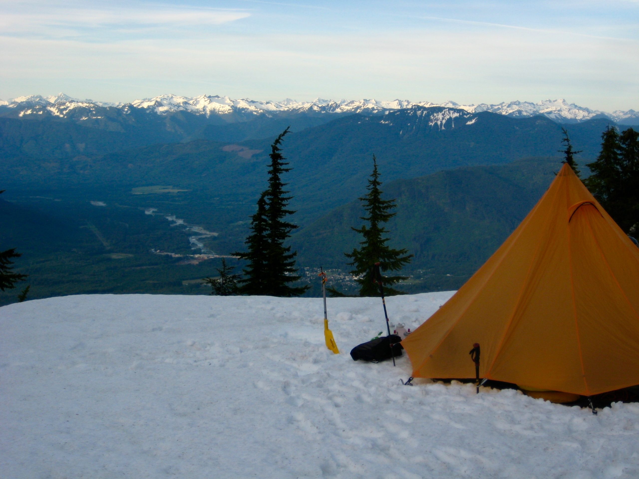 Upon arriving at 4800-foot Lone Tree Pass (6.5 hours + 4350 feet from car), we turned left and contoured for ½ mile to a broad snow platform at 4900 feet on the crest of Whitehorse Ridge (7.0 hours + 4450 feet from car).  This platform provides room for a dozen or more tents, along with an outstanding view of the entire northwestern Cascade Range extending from Mt. Baker to Dome Peak.