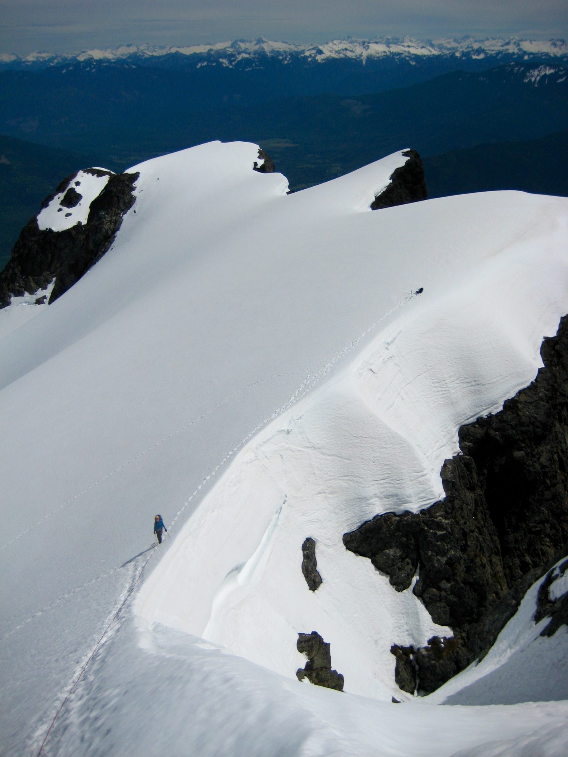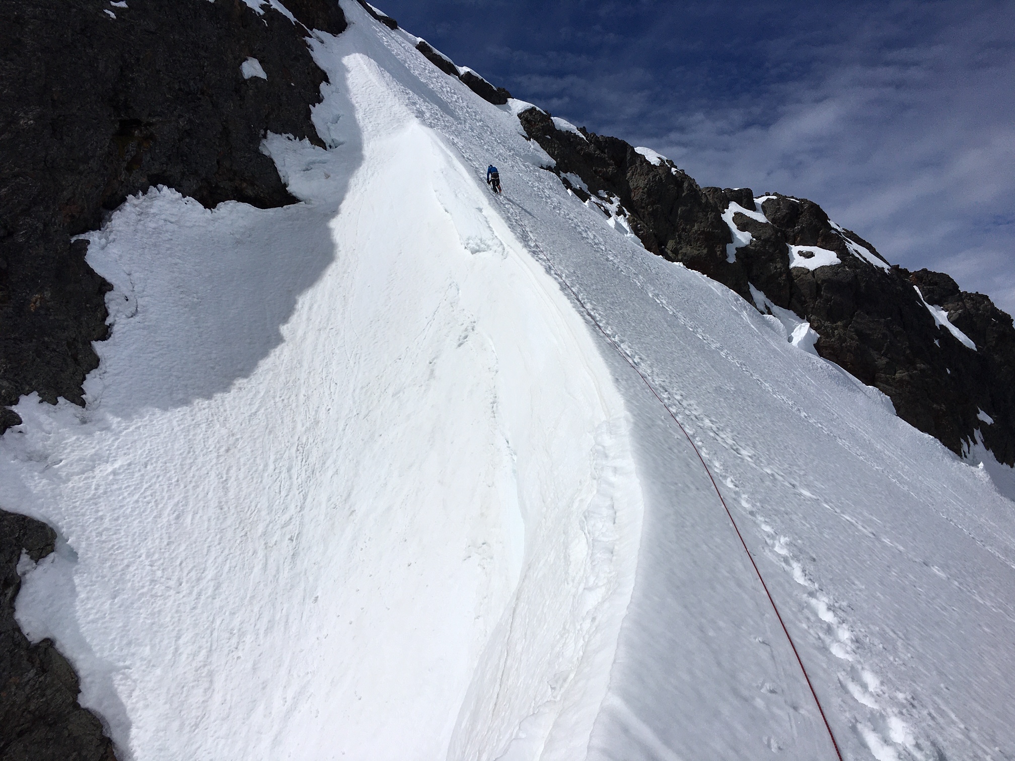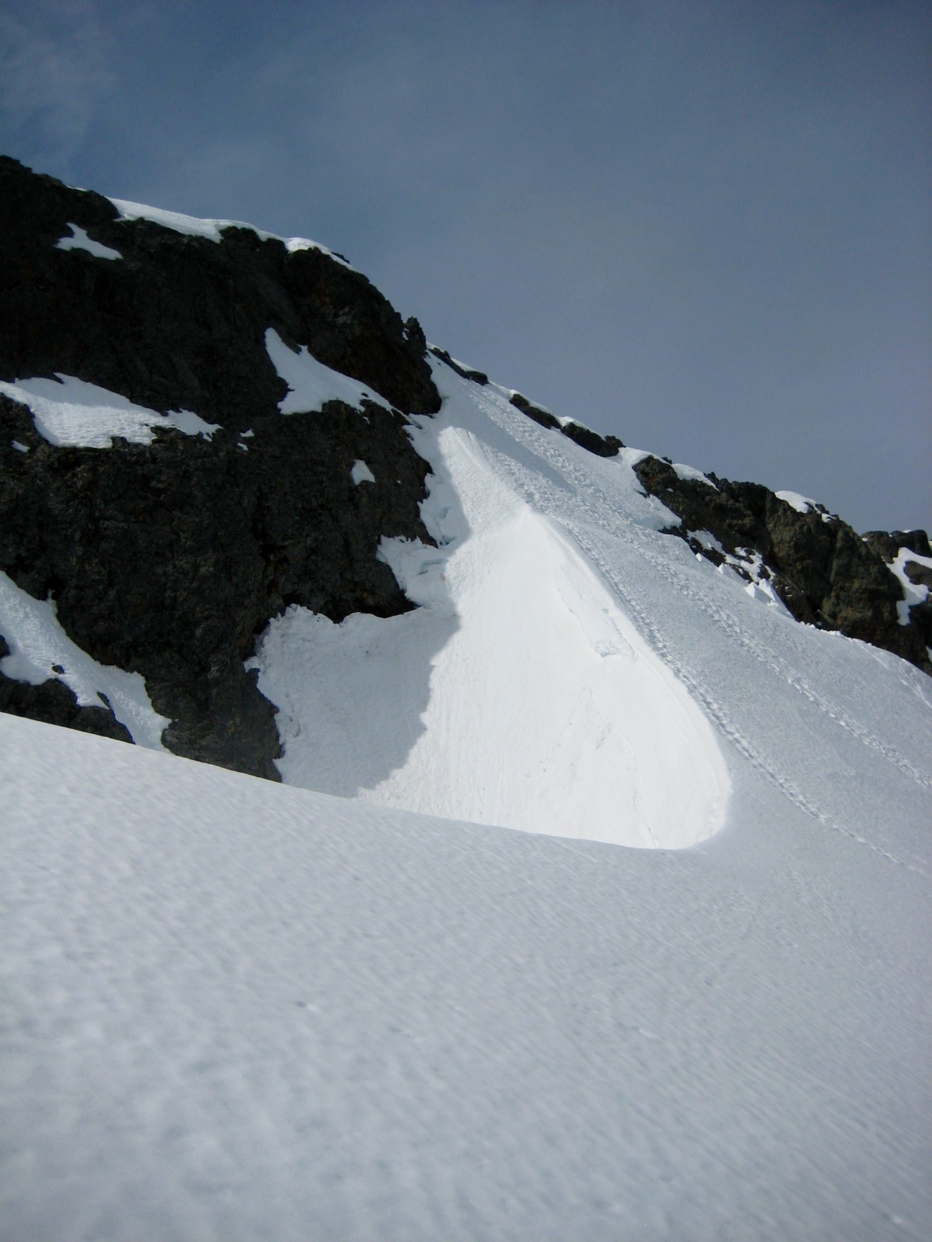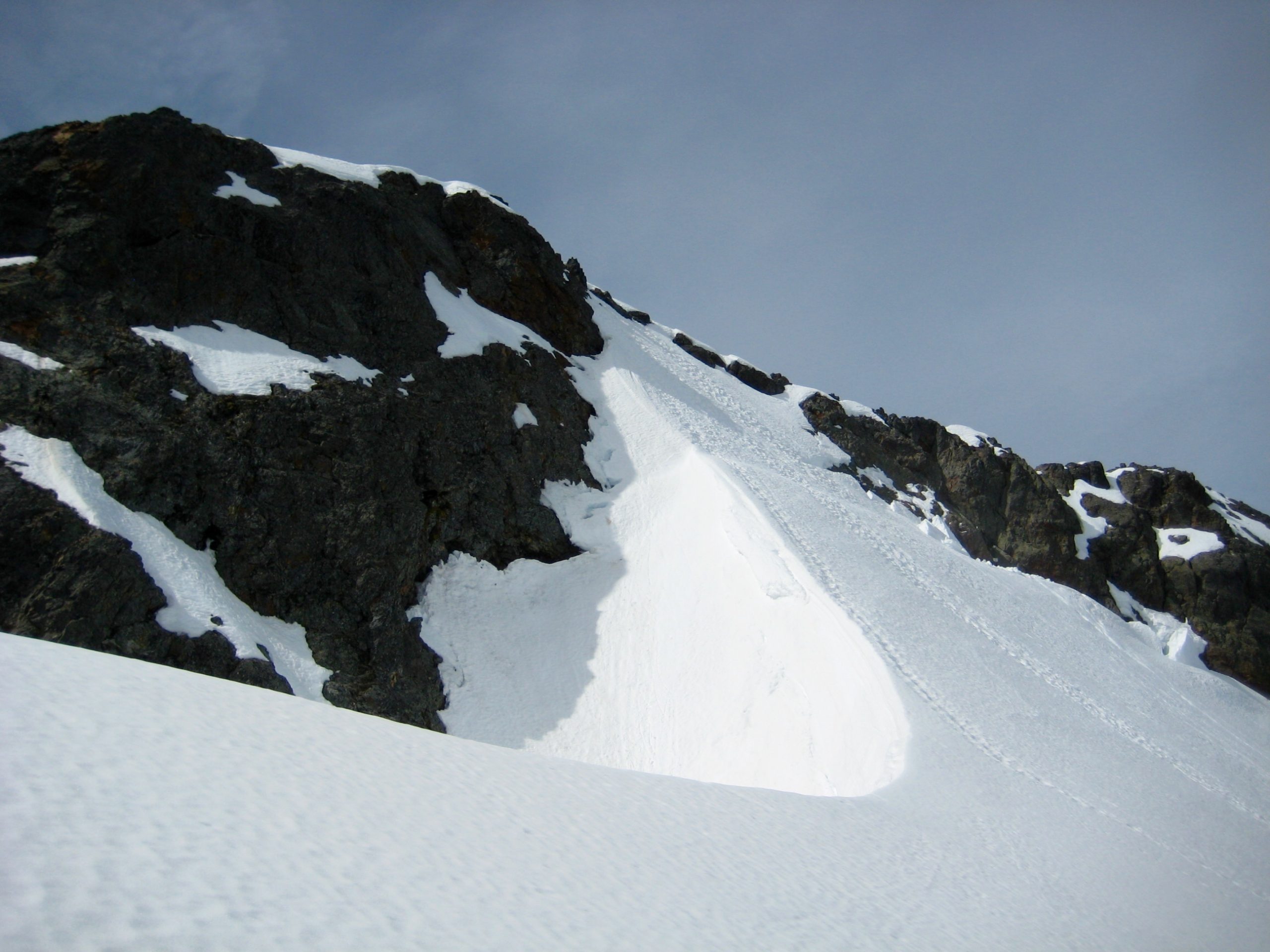 We crossed under the north face of the summit block and stopped on the crest of a wind cirque.  This was a convenient place to rope up for our final ascent of the summit snowfinger.