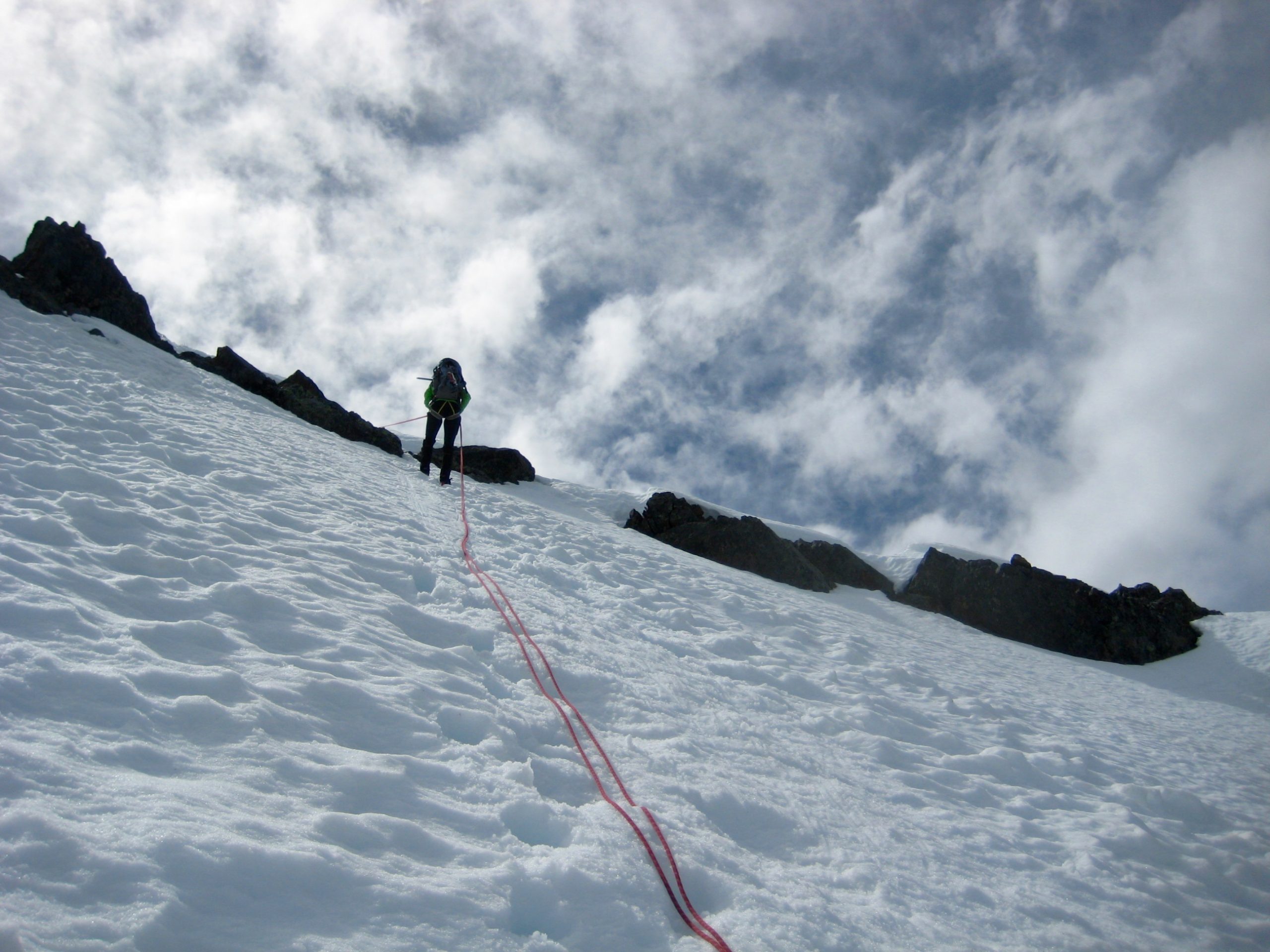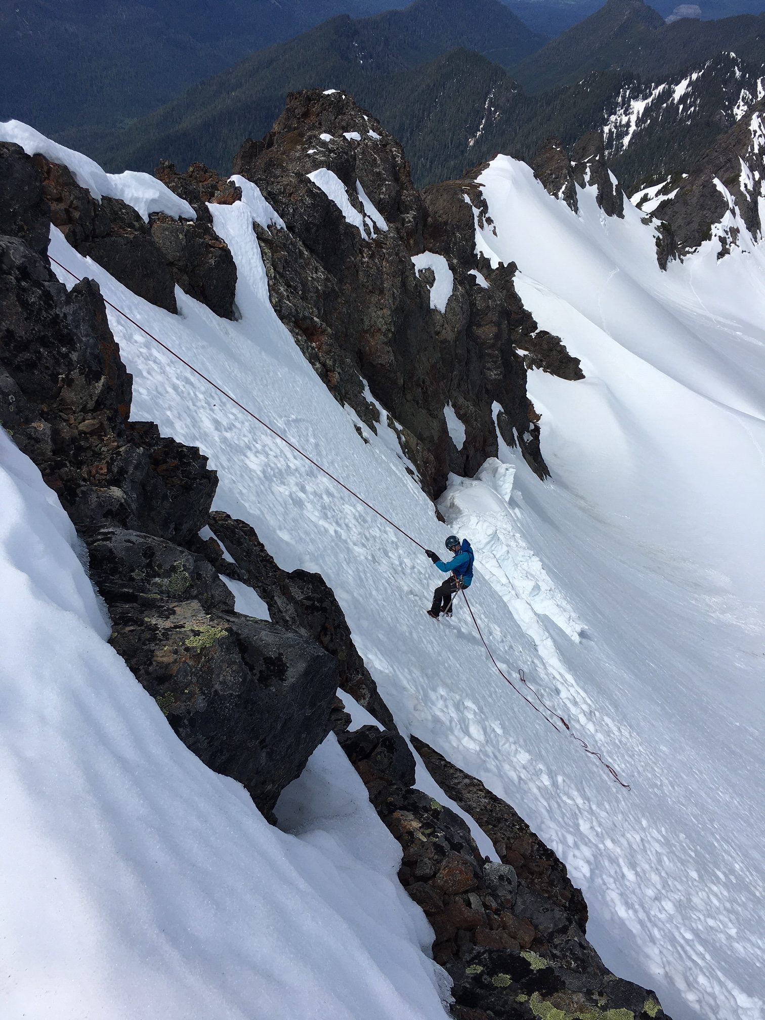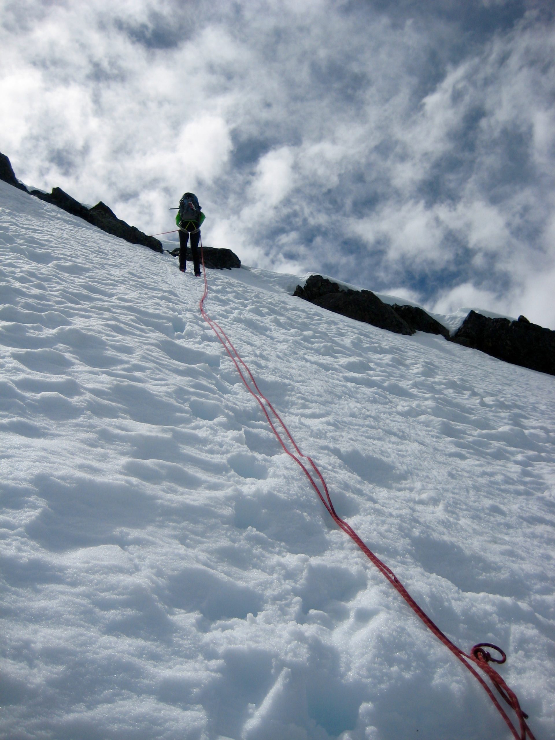 Our descent involved one rappel off the summit ridge, using a rock anchor.  This got us just past the steepest and most exposed portion of snowfinger, such that we could readily boot down the remainder.