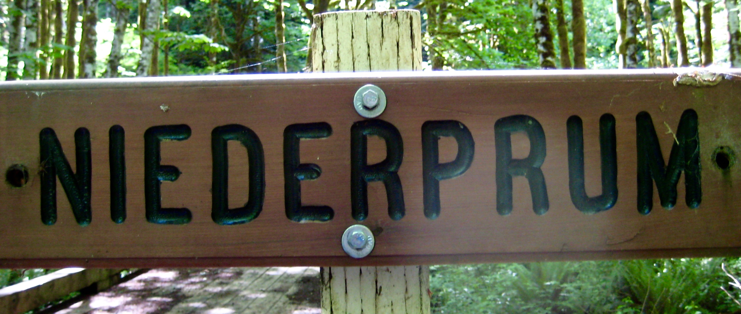 There were no other cars parked at the trailhead, which is located just before the Moose Creek Bridge on Mine Road, but there was a new sign marking the start of the Niederprum Trail.  Incidentally, this name gets spelled “Neiderprum” in many references (such as 100 Hikes), but both the trailhead sign and local historian Harry Majors (author of Exploring Washington) agree that it is spelled “Niederprum.”