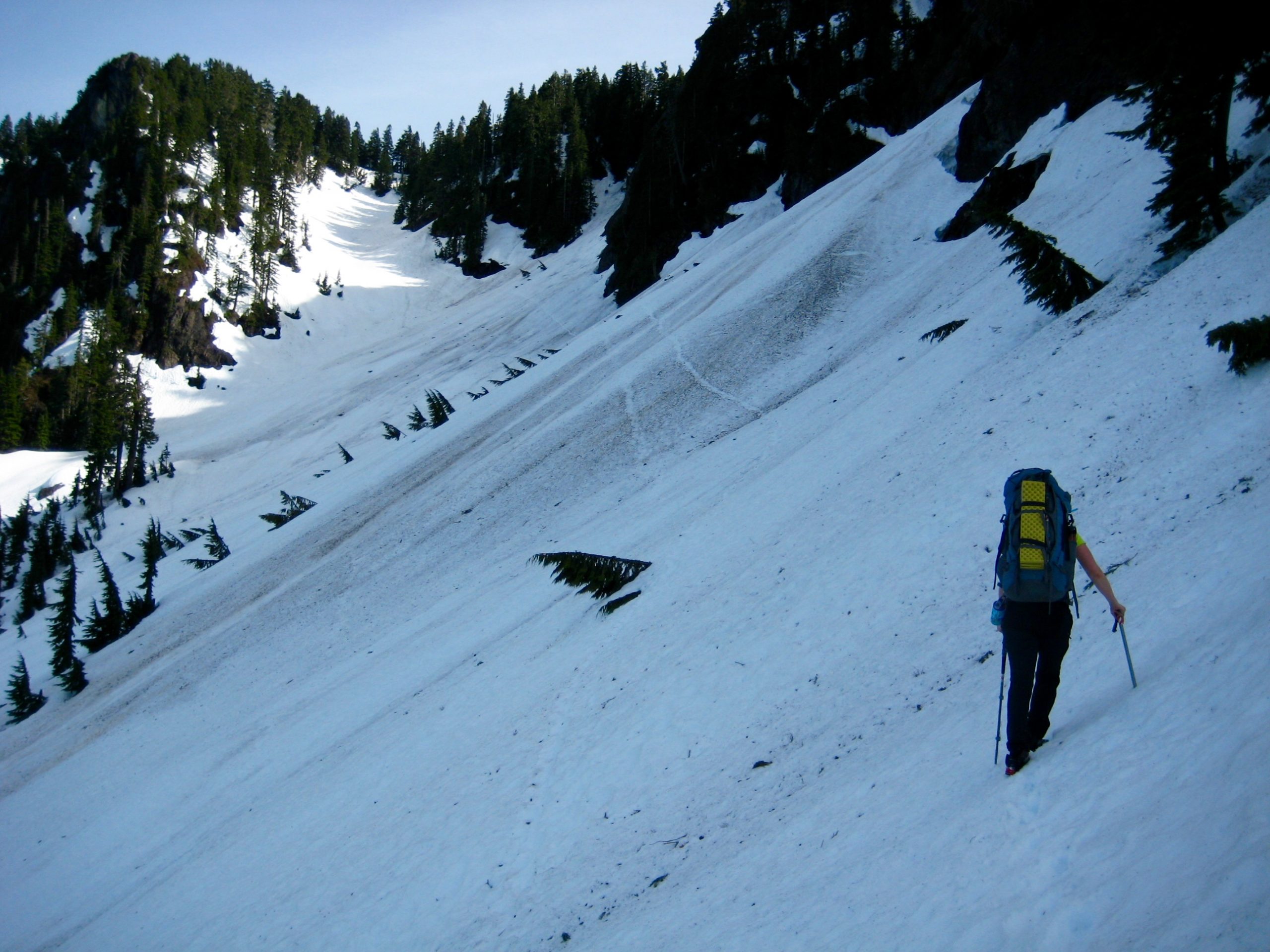 We booted straight uphill to a 4100-foot sloping bench, which lies near the location of the former Niederprum Mine and also marks the spot where most climbers begin a leftward traverse over to Lone Tree Pass.  A conspicuously large, broken, silvered snag stands in the middle of this bench; could it be the eponymous “lone tree”?  I don’t know, but I do know that our crampons were particularly welcome on the steep snowfield leading to the pass.
