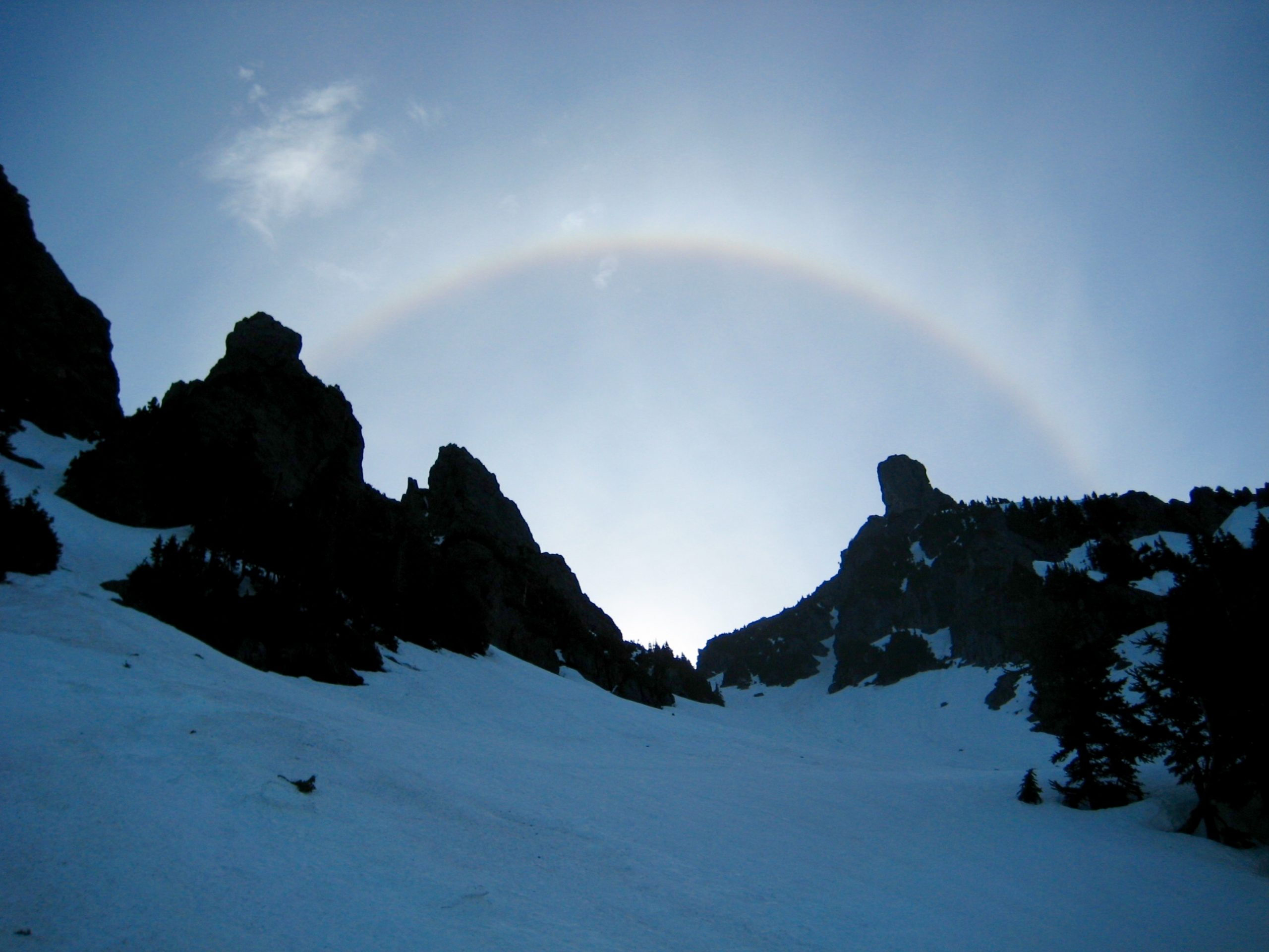 Following a wind-free night, we awoke to a lightly overcast sky and were underway at 6:30am.  From camp, we descended 350 feet into a small lake bowl, then began a gently rising traverse toward High Pass.  Our traverse route stayed in moderately dense forest between 4500 and 4700 feet until reaching a broad snow couloir leading up to the pass.  The distinctive blocky tower of White Benchmark (Point 6357) serves as a lighthouse for the ascent to High Pass.  A timely solar halo also showed the way.
