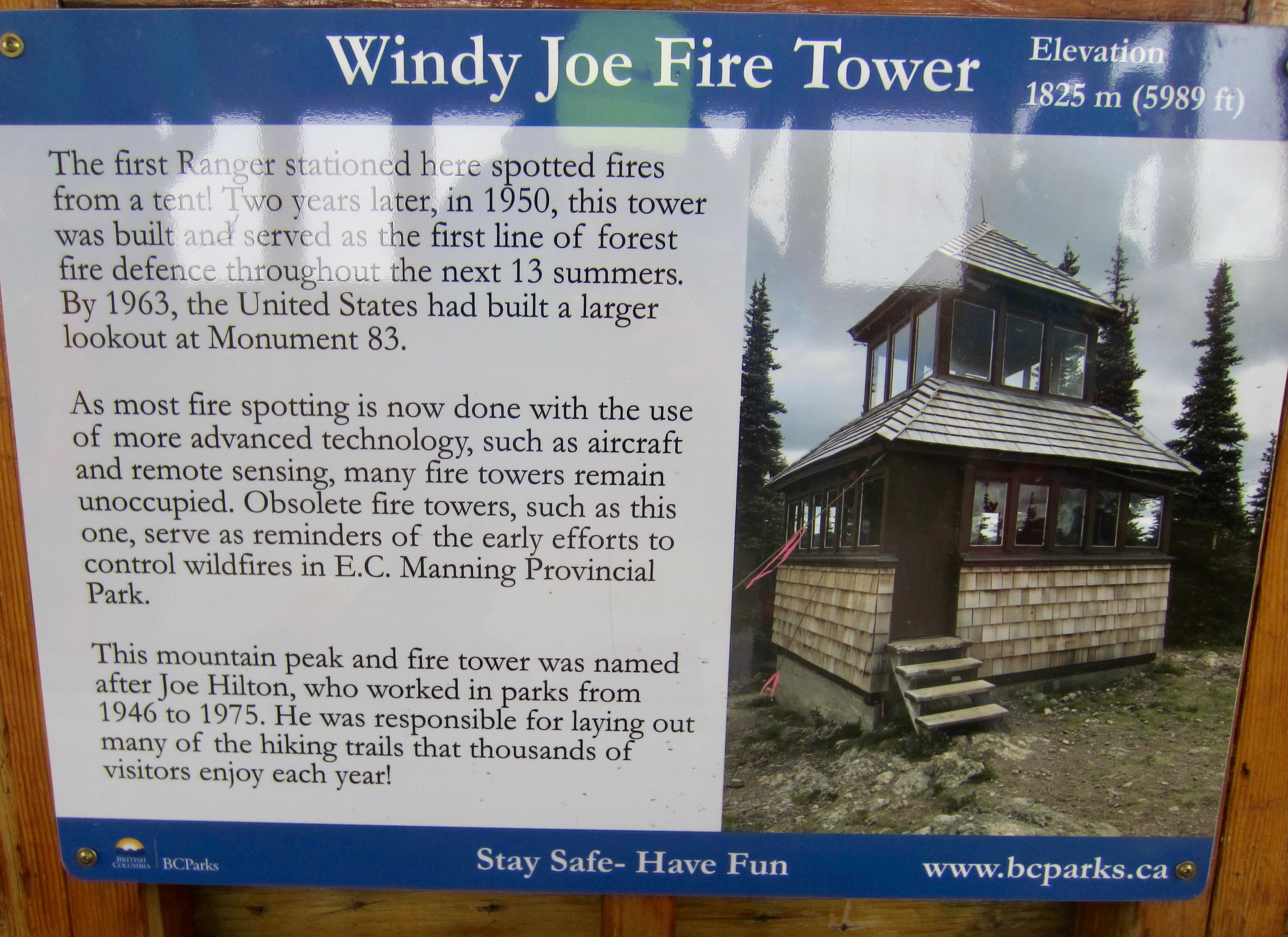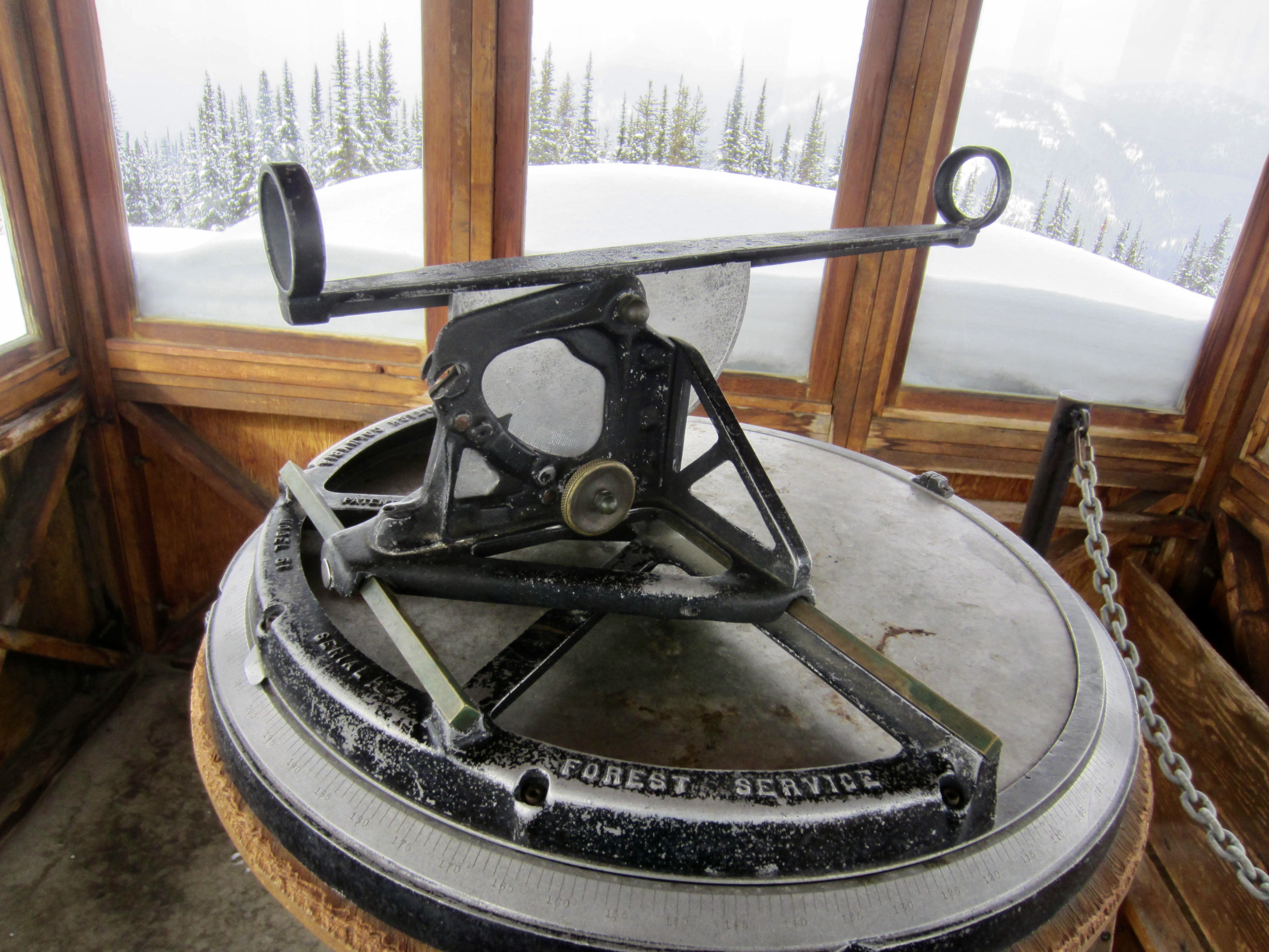 The cabin interior has two sitting benches and an informational placard, explaining that the structure was built in 1950. Upstairs, the cupola still has an operational fire-finder in place, along with annotated photographs that form a complete 360-degree panorama.