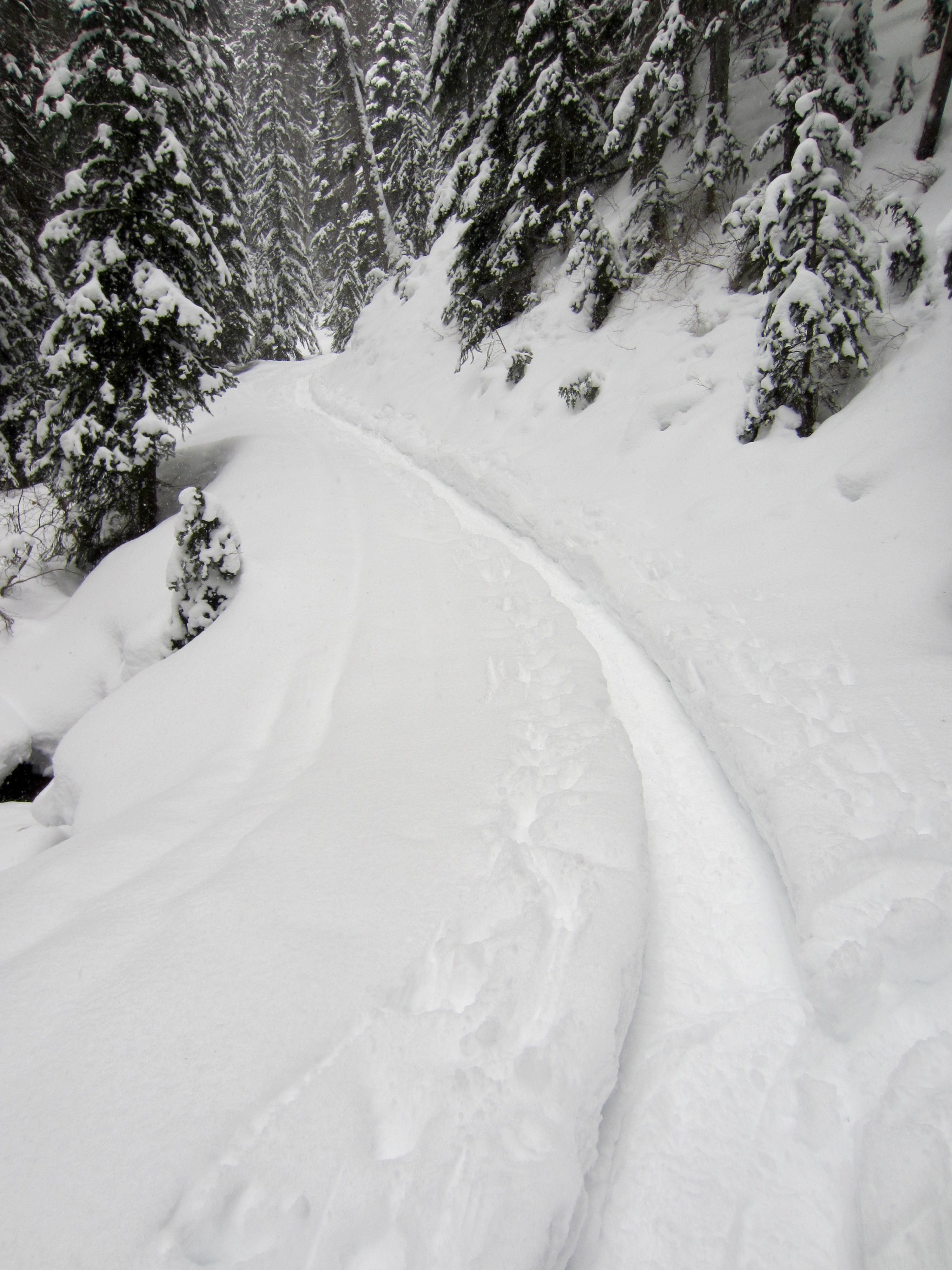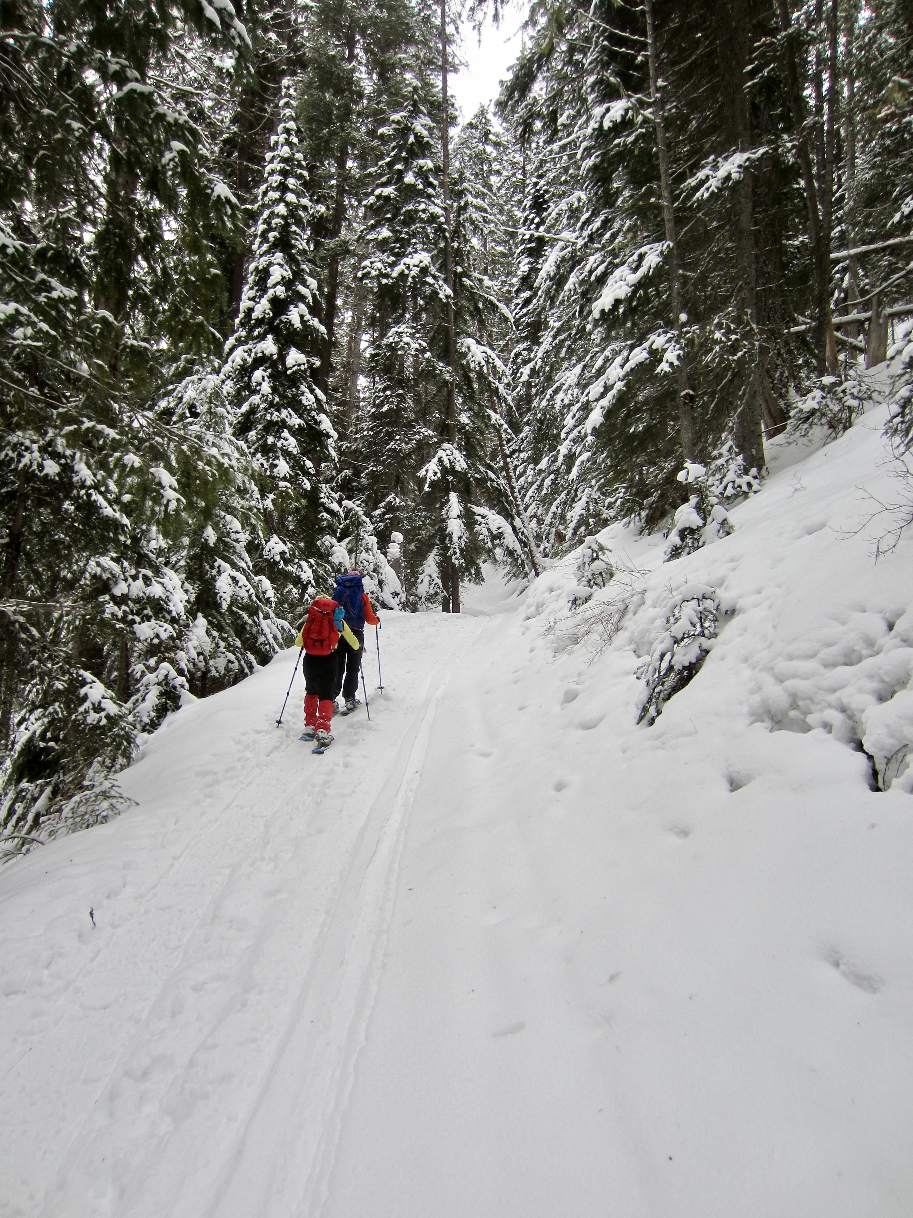 After crossing the river, we headed back downstream on the Similkameen River Trail for 1¼ miles to a well-marked junction. Here, we veered to the right on the Windy Joe / Frosty Mountain / Pacific Crest Trail, which makes a gradual climb through dense forest. The trail was easy to follow, having been thoroughly tracked out by previous snowshoers, booters, and skiers.