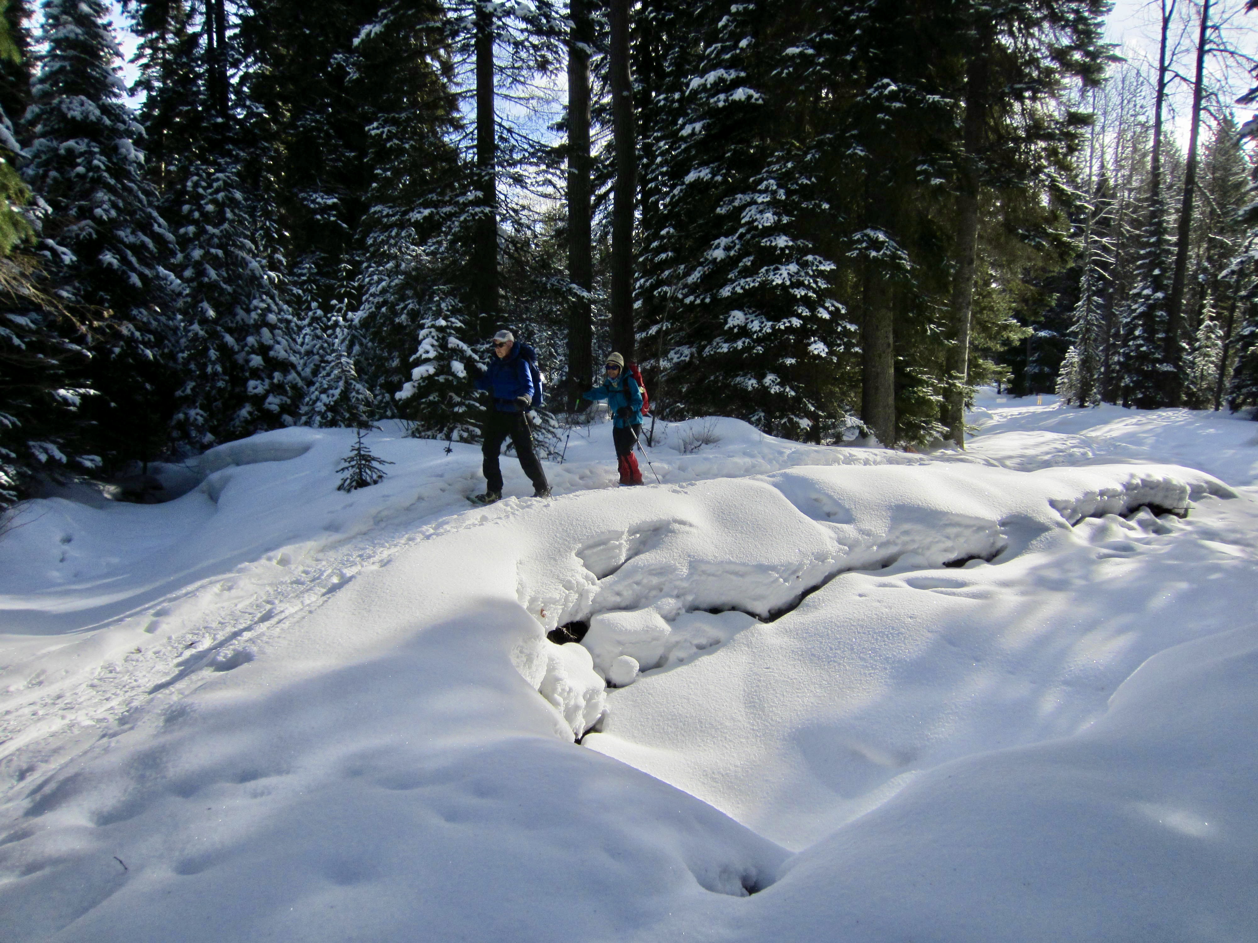 We started at the “Muddy Beaver” Trailhead within the resort and walked down a groomed ski trail to the Similkameen River, then we followed a winding snowshoe track upstream for ½ mile to a vehicle bridge on Gibson Pass Road. The morning was pleasantly sunny, but snow flurries were in the afternoon forecast.