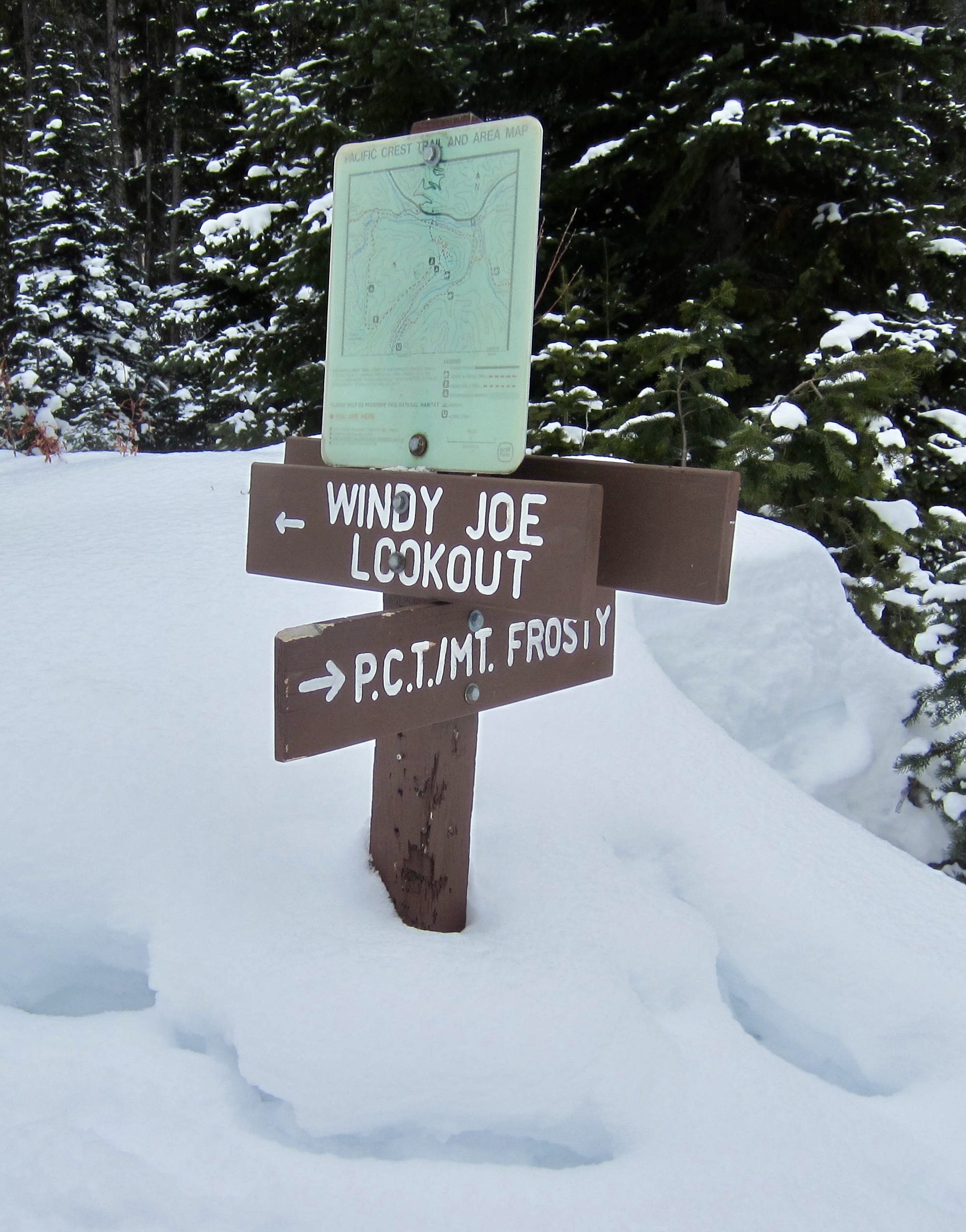 In another 2 miles, we reached a higher junction where the Frosty Mountain / Pacific Crest Trail continues straight ahead and the Windy Joe Trail switches back to the left. Staying on the latter trail, we ascended steeper forest slopes on the western flank of Windy Joe Mountain.