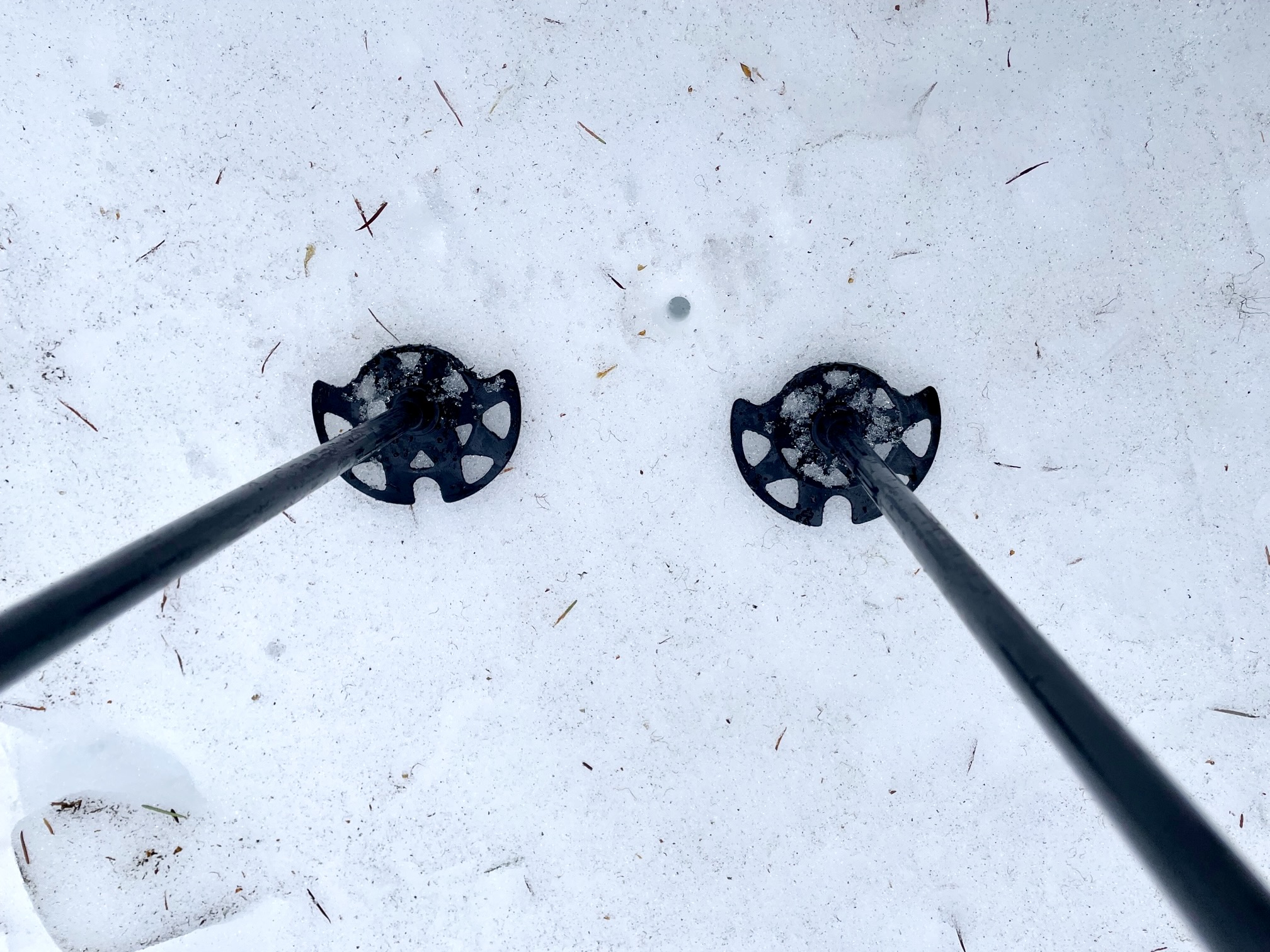 My preferred option for a XC/BC hybrid ski tour is a two-section adjustable pole with a carbon-fiber lower shaft. This design offers several important advantages: First, compared to a one-section pole, the adjustability of a two-section pole allows me to shorten both poles when skinning straight uphill, to lengthen both poles when kicking-and-gliding on flat terrain, and to create uneven pole lengths when making a long sidehill traverse. Second, a two-section pole is both lighter and more reliable than a three-section pole, simply because there is no joint or extra material in the lower region. Third, the use of carbon fiber for the lower section further reduces the “swing weight” of the pole, which might seem insignificant during the first hour of a ski tour but becomes much more noticeable after several hours of active poling.