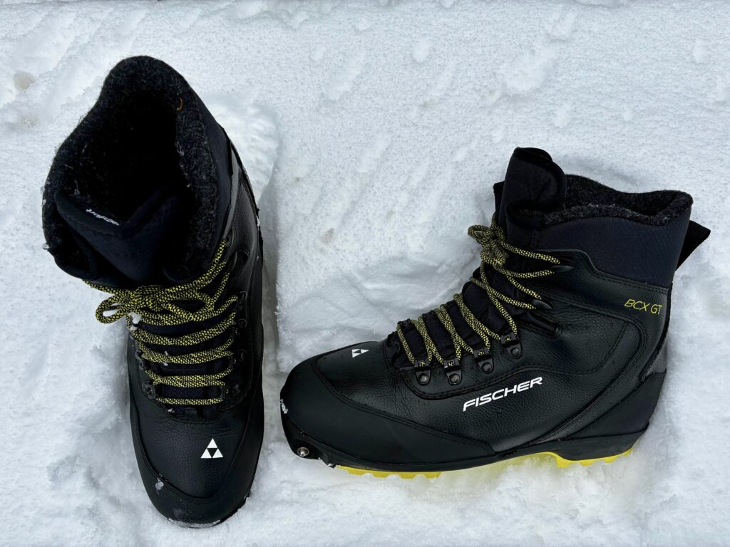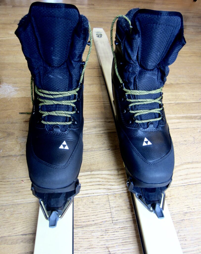 Based on my positive experience with a pair of Fischer’s Transnordic 75-mm boots, I purchased a pair of their BCX Grand Tour XP boots. These Xplore-compatible boots have a nice all-leather upper, just like the Transnordic, but are cut several inches lower. They are very well-insulated and were comfortable right out of the box. A 4-hour tour in wet snow on a rainy day demonstrated that they are very resistant to water intrusion.