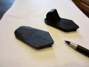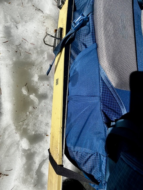 The binding’s heel pieces are equipped with heel lifters, or climbing bars, which are designed to reduce strain on ankles and calves when ascending a fairly steep slope. When not being used, they fold down snugly and maintain a low profile. I will mention, however, that this low profile makes the bars difficult to raise when wearing gloves or mittens. Anyway, an additional benefit of these bars is that they provide a “strap stop” when strapping your skis onto your backpack (see photo below).