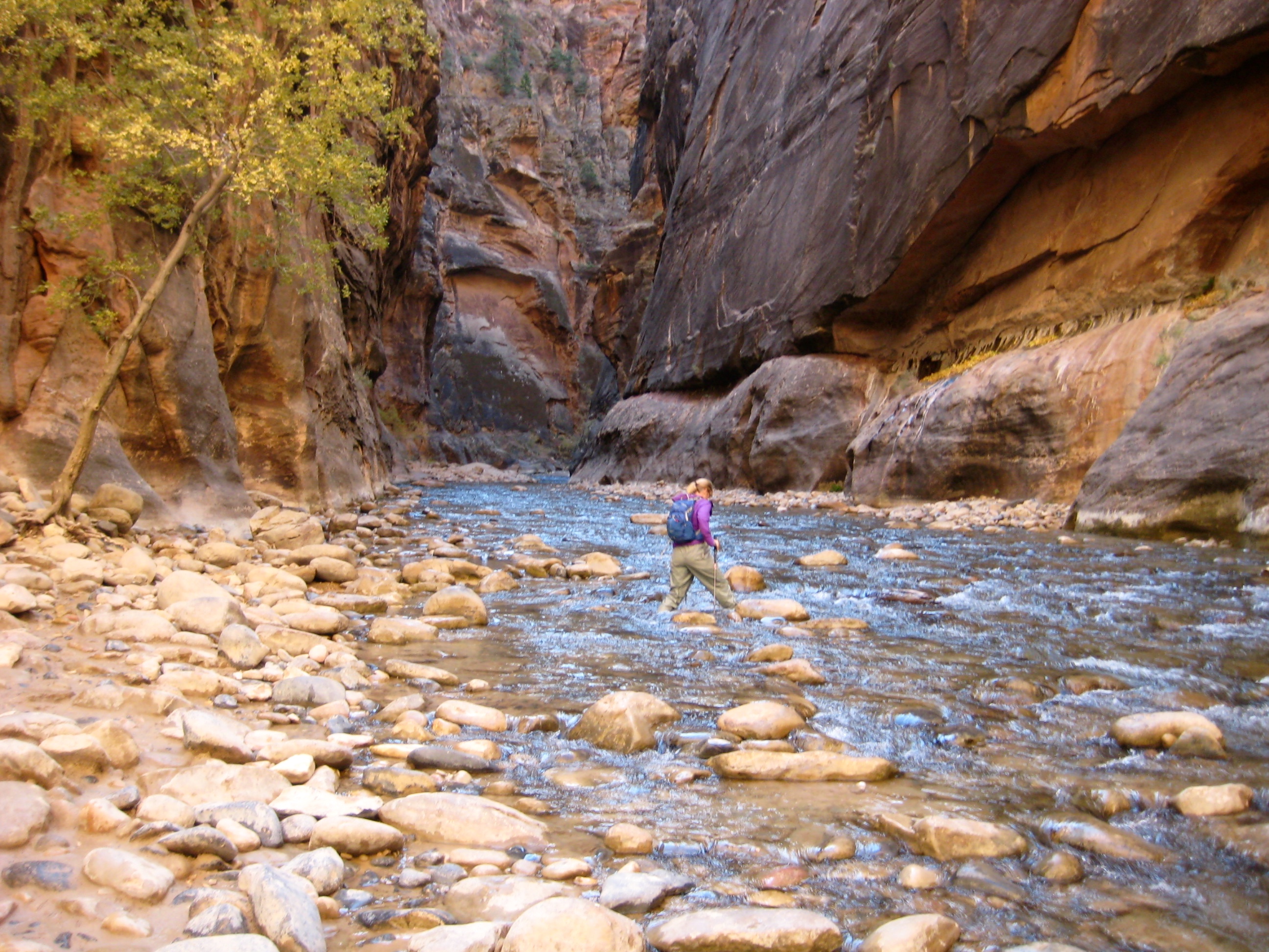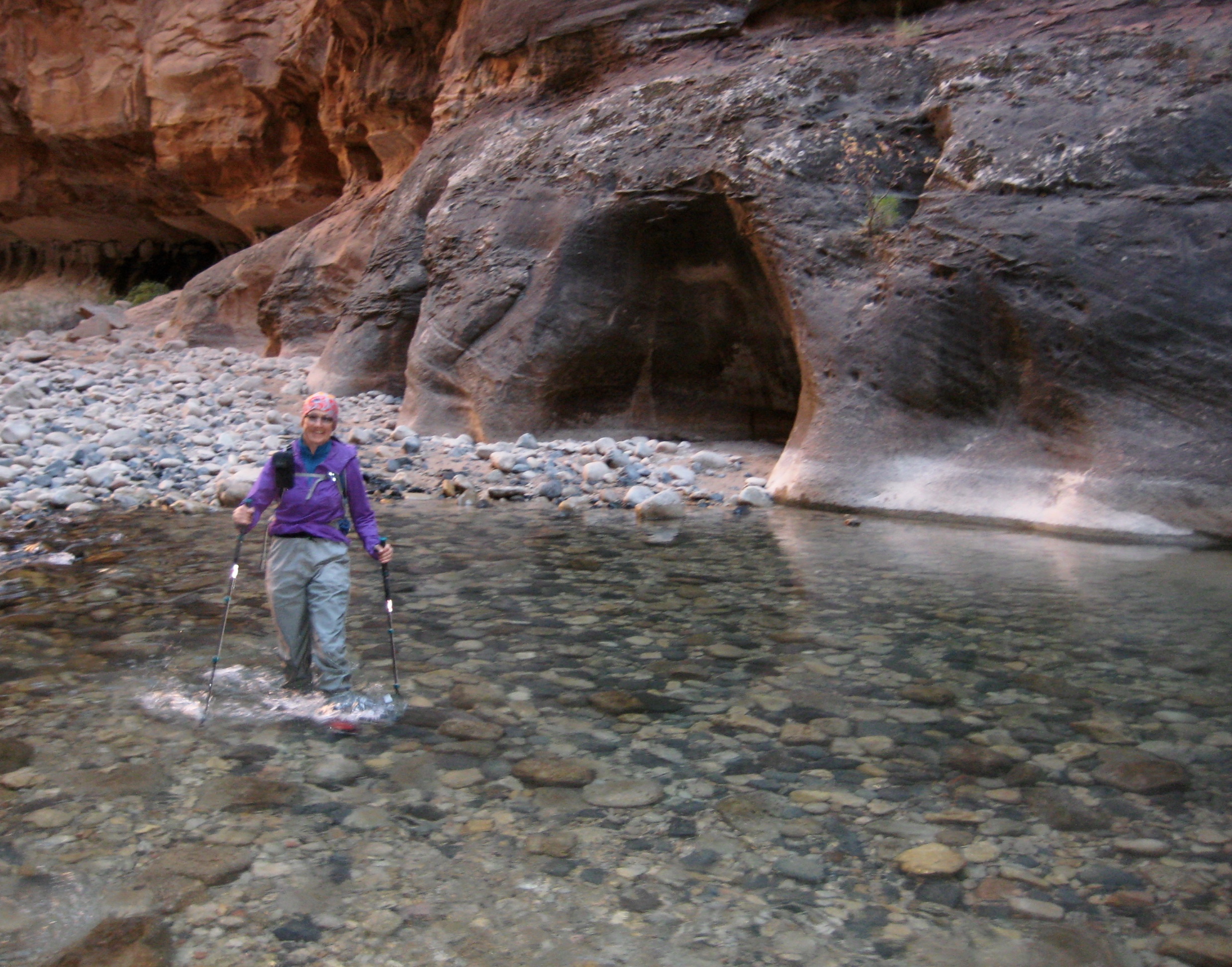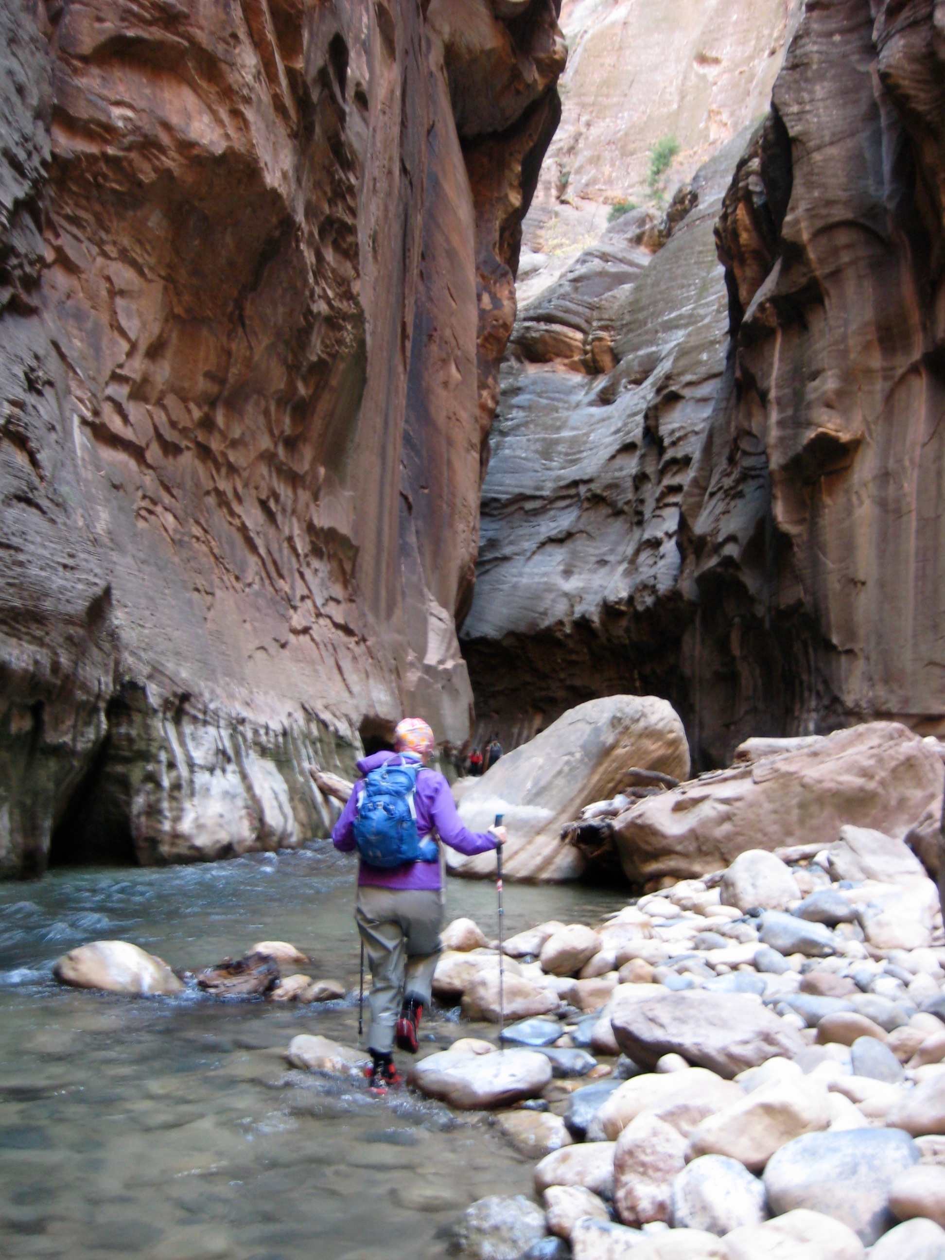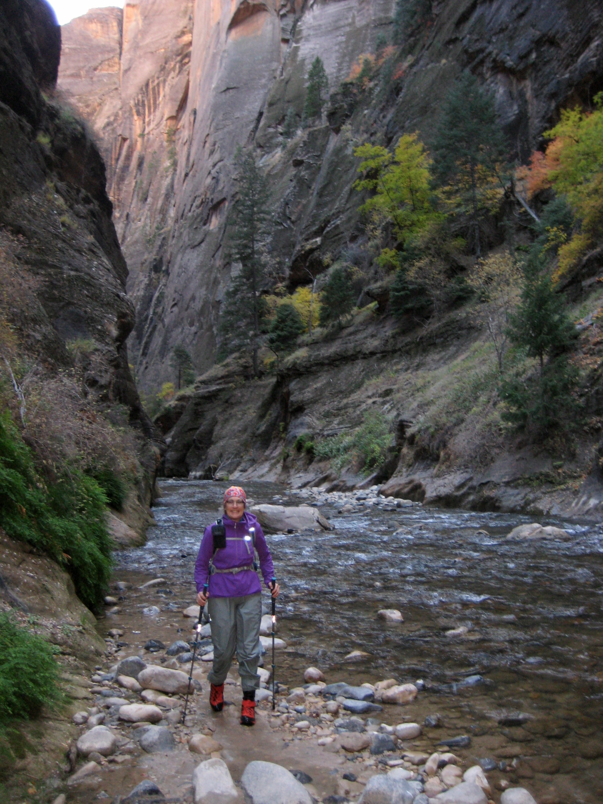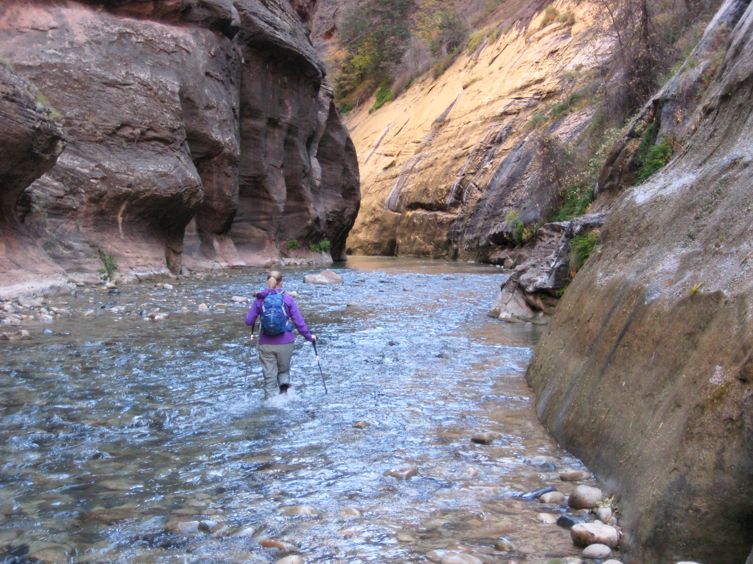 Before our trip, we’d seen dozens of photos showing large groups of tourists happily wading through The Narrows while wearing shorts, tee-shirts, and sneakers. This attire passes muster in mid-summer, when air temps are in the 90s and 100s, but as Eileen and I discovered, it is woefully inadequate during the chilly days of autumn. We found that dry pants, neoprene water socks, and canyoneering shoes were necessary for comfort—if not downright survival—in November. In fact, shorter folks would be advised to wear “dry bibs” or “dry suits” if traveling beyond Orderville Canyon. Also, most rental packages include a wooden walking stick, which is very useful if you don’t have trekking poles.