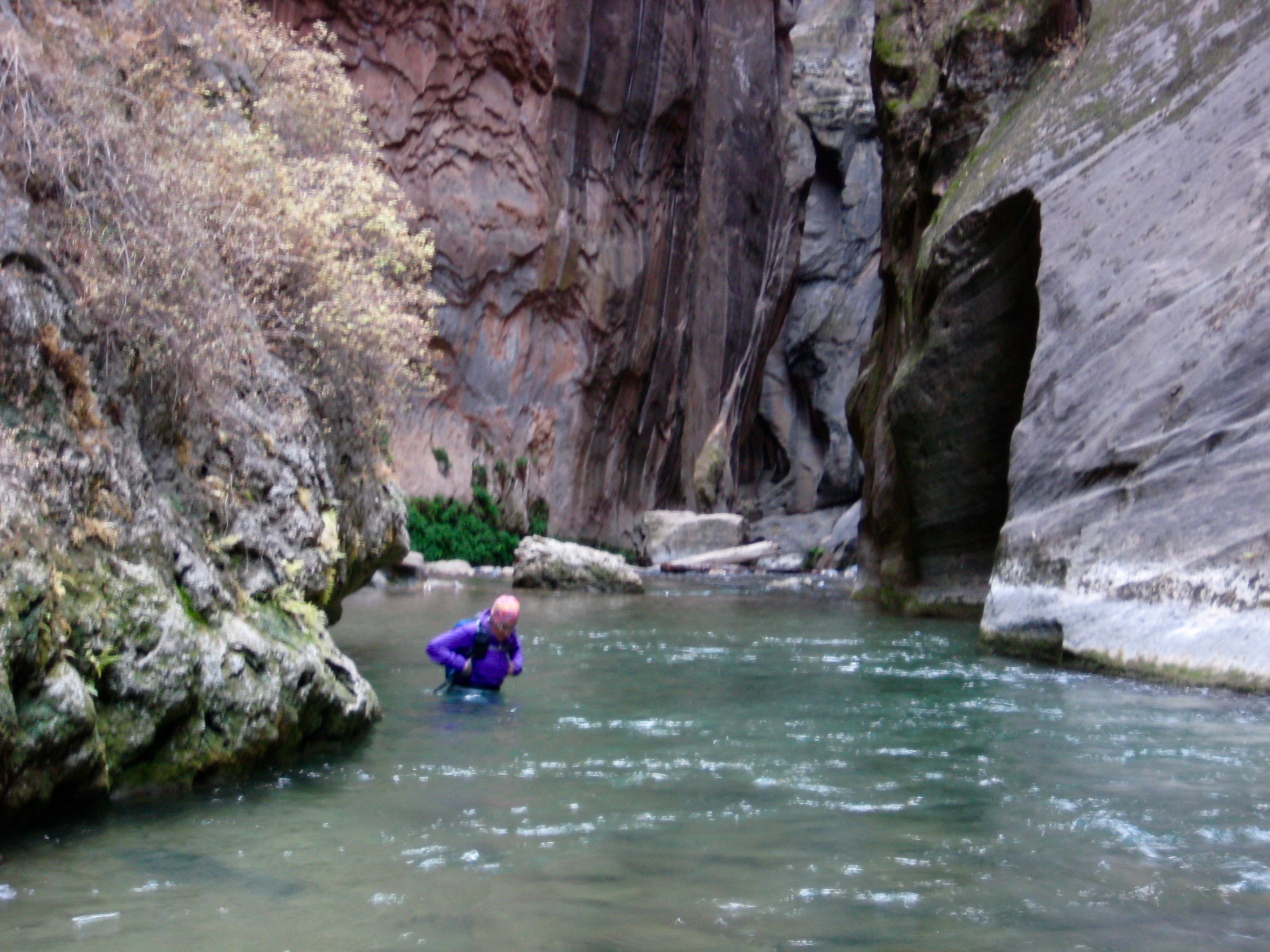 We hastily retreated to the town of Springdale, where dry pants, water socks, and canyoneering shoes could be rented for the reasonable price of $40 per person at Zion Outfitter. Less than 2 hours later, we were back at Mouth of the Narrows for a second attempt. We again plunged into the frigid river and began wading upstream. It went better this time. Our new clothing did an admirable job of fending off the cold, and we were able to keep going.