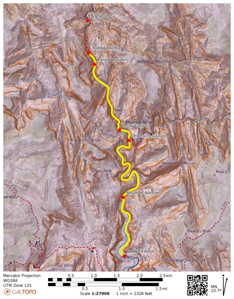 By mid-afternoon, we reached a point about 1/2 mile below Big Springs, another significant landmark. It was tempting to push forward, but this seemed to be a logical turnaround point given the time (3.2 hours + 3.7 miles + 270 feet from TH).