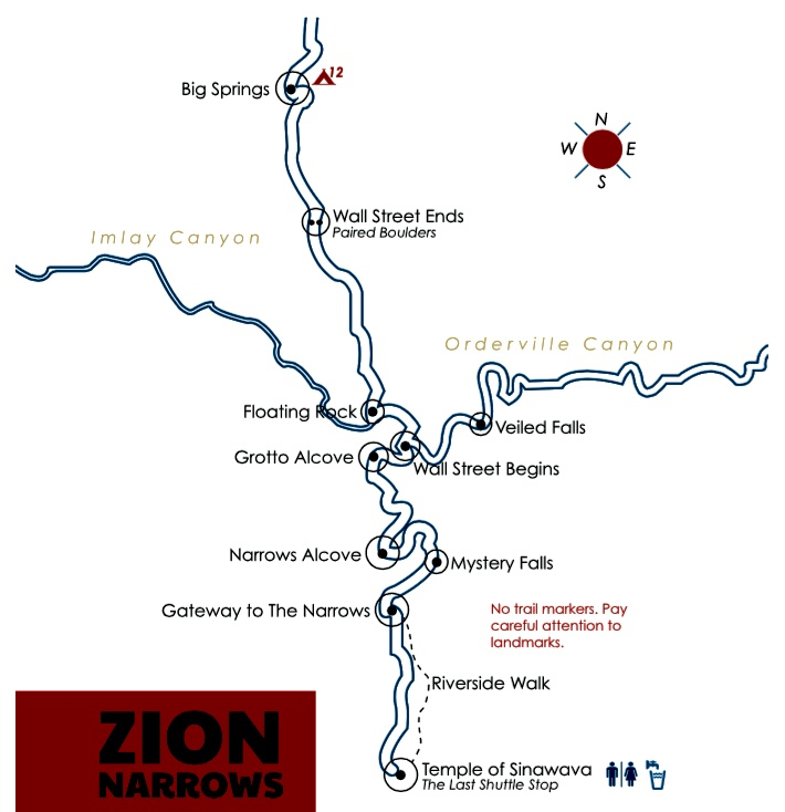Way Points: Mouth of the Narrows (hike via Riverside Walk); North Fork Virgin River & The Narrows & Mystery Falls & Narrows Alcove & Grotto Alcove & Orderville Canyon Confluence & Wall Street & Floating Rock & Paired Boulders (off-trail hike & river wade)