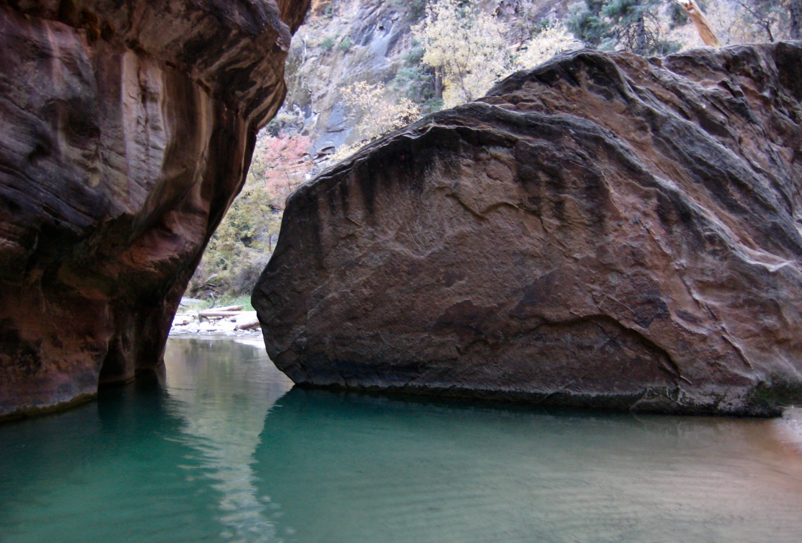 Just beyond “Floating Rock,” Wall Street ends and the canyon widens out again. Additionally, certain parts of the river become deeper; the water was up to, or slightly above, our waist in one or two spots.